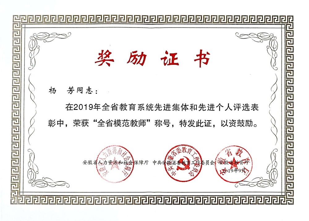 楊芳榮獲2019年“全省模范教師”稱號