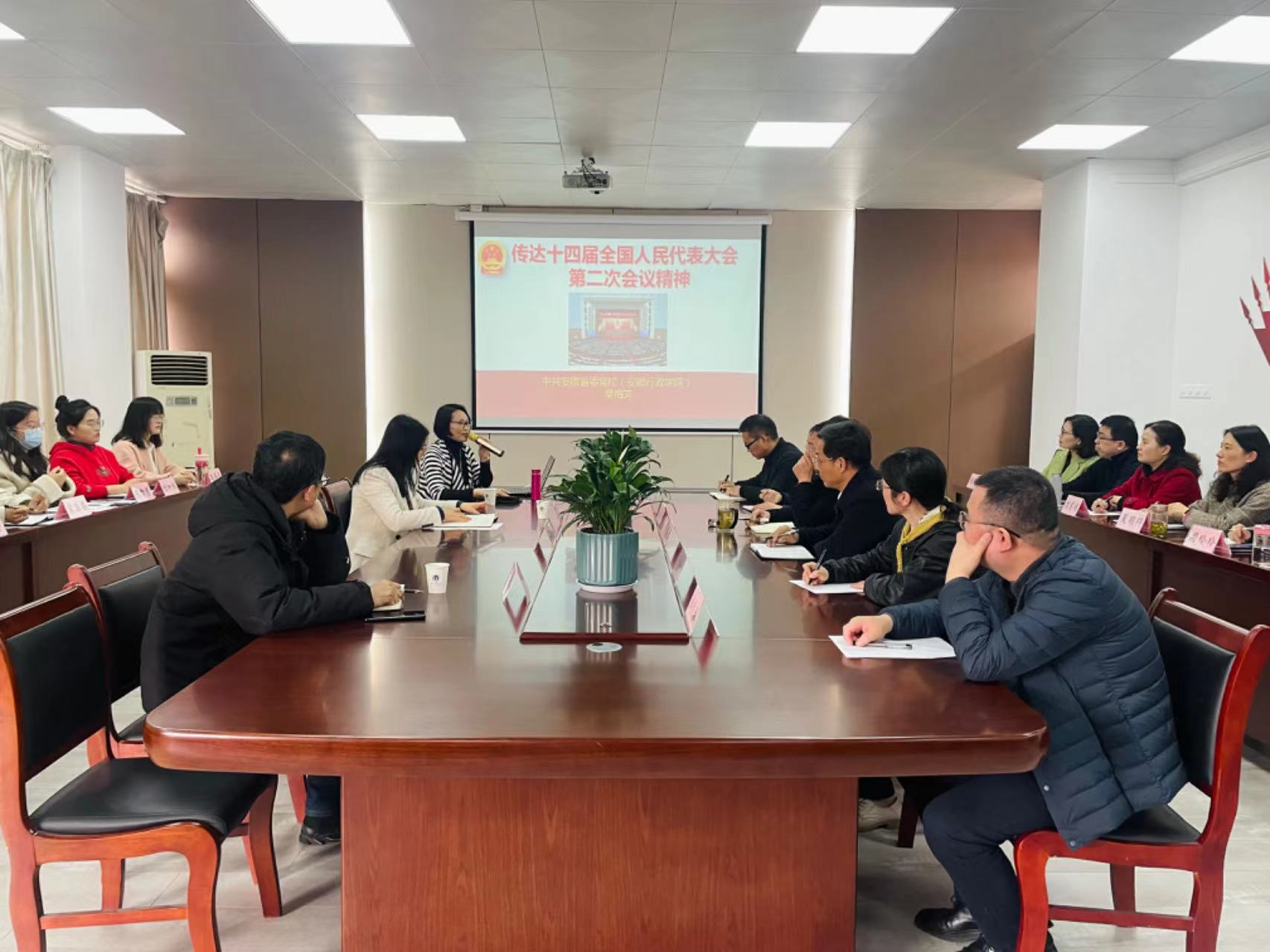 吳梅芳教授總結(jié)了科研項(xiàng)目成功申報(bào)的經(jīng)驗(yàn),分享了申報(bào)過程中的細(xì)節(jié)與體會(huì),從分析科研項(xiàng)目申報(bào)現(xiàn)狀出發(fā),重點(diǎn)就高級(jí)別科研項(xiàng)目申報(bào)前期準(zhǔn)備、選題確定、申請(qǐng)書撰寫等方面的注意事項(xiàng)進(jìn)行了詳細(xì)的介紹和講解。強(qiáng)調(diào)選題要緊密結(jié)合學(xué)術(shù)前沿和國(guó)家地方政府政策,申報(bào)書填寫要格式規(guī)范、表述準(zhǔn)確、邏輯清晰、論證有力,以提升項(xiàng)目申報(bào)的規(guī)范性和成功率。接著,吳梅芳教授從兩會(huì)基本情況、兩會(huì)的主要精神、安徽代表團(tuán)參會(huì)情況等方面,生動(dòng)介紹了全國(guó)兩會(huì)盛況,詳細(xì)解讀了習(xí)近平總書記在全國(guó)兩會(huì)期間的重要講話精神和全國(guó)兩會(huì)精神。在傳達(dá)兩會(huì)精神的過程中,她結(jié)合具體授課內(nèi)容,著重向與會(huì)教師講述了自己的備課方法和搜集資料、組織內(nèi)容的流程,強(qiáng)調(diào)上好一堂課要精心制作課件,耐心打磨內(nèi)容,用心理清邏輯。