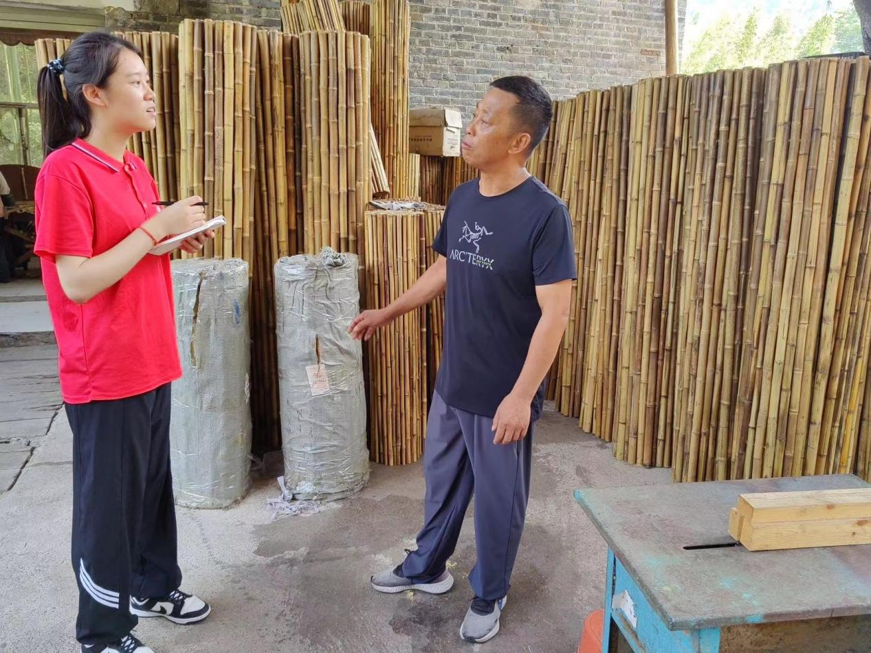 “簇簇燕綠山間揚,根根翠竹新路壯。竹韻芬芳手藝精,工匠傳承創(chuàng)新立?!鄙铰窂潖潱魉?。隊員們一路跋山涉水來到竹林深處一家竹制品加工廠。淳樸憨實的工廠老板邵名忠熱情接待了這群不意而來的青年人,詳細介紹了工廠的每種產(chǎn)品。該竹制品原料是當?shù)胤N植的燕竹,長成后運到工廠曬干,后經(jīng)碳火烤制,人工掰彎取直,放陰儲存,打蠟制造。該廠與一些裝修公司進行生意合作,產(chǎn)品主要用于普通房屋、別墅花園、飯店包廂裝潢以及城市公園建設(shè)等。同時,工廠還采取新型電商經(jīng)營,淘寶開店“竹匠工坊”,由老板女兒管理,父女合作經(jīng)營,忙并快樂著。小小一座竹坊,不僅給經(jīng)營戶帶來了踏實的幸福,旺季時候更能吸納一二十人就業(yè),大大增加了附近農(nóng)戶的收入。隊員們不禁深切感受到鄉(xiāng)村振興,離不開實業(yè)的發(fā)展。深耕實業(yè)無疑是助力鄉(xiāng)村振興的最好詮釋。