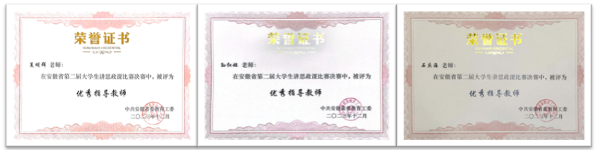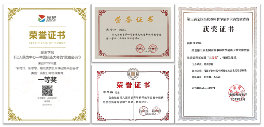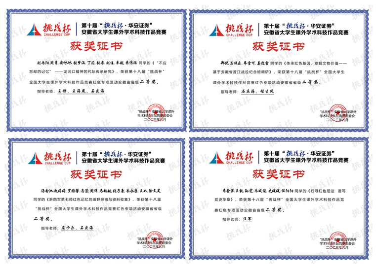 近年來,馬克思主義學院積極聯動校黨委宣傳部、學工部、團委,指導建立明德學社、知行學社、紅色文化研習社、湯山講“習”社等大學生理論社團,積極組織教師指導學生開展暑期“三下鄉”社會實踐、“挑戰杯”紅色專項、大學生創新創業、大學生講思政課等活動與賽事,先后榮獲第十屆“挑戰杯”安徽省大學生課外學術科技作品競賽(紅色專項)省級二等獎 4 項、三等獎 1 項、安徽省 2023 年大學生暑期“三下鄉”社會實踐活動優秀調研報告評比省級二等獎 1 項、安徽省第二屆大學生講思政課公開課展示活動皖中片區賽二等獎 2 項、三等獎 1 項,安徽省決賽二等獎2 項。以參加各類比賽為契機,馬克思主義學院不斷推動思想政治理論課改革創新,激發學生學習積極性,增強思想政治理論課的思想性、理論性、親和力與針對性。