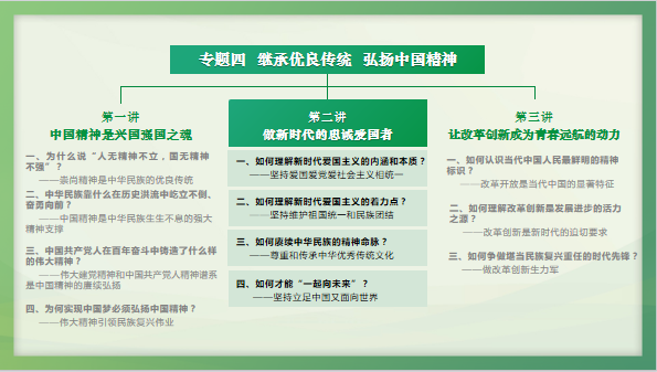 備課會上,兩位老師結合審核評估的教學要求和統一課件特點,圍繞“專題四 繼承優良傳統 弘揚中國精神”展開了教學分享。王靜老師首先分享了專題四第二講“做新時代的忠誠愛國者”的教學內容。她逐一講述了本講的教學設計、邏輯結構、重難點內容、教學案例。接著,王暉老師分享了專題四第三講“讓改革創新成為青春遠航的動力”,他對該講的內容進行了適度的擴展,融入了黨的創新理論的最新成果,做了教學設計的優化。
