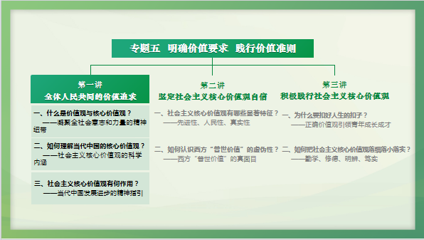 備課會(huì)上,兩位老師結(jié)合審核評(píng)估的教學(xué)要求和統(tǒng)一課件特點(diǎn),圍繞“專(zhuān)題五 明確價(jià)值要求 踐行價(jià)值準(zhǔn)則”展開(kāi)了教學(xué)分享。過(guò)慈明老師首先分享了專(zhuān)題五第一講“全體人民共同的價(jià)值追求”的教學(xué)內(nèi)容。她逐一講述了本講的教學(xué)設(shè)計(jì)、邏輯結(jié)構(gòu)、重難點(diǎn)內(nèi)容、教學(xué)案例,強(qiáng)調(diào)要厘清價(jià)值觀(guān)與核心價(jià)值觀(guān)的內(nèi)涵,認(rèn)清核心價(jià)值觀(guān)的作用。接著,開(kāi)琛老師分享了專(zhuān)題五第二講“堅(jiān)定社會(huì)主義核心價(jià)值觀(guān)自信”,她對(duì)該講的內(nèi)容理論性和思想性進(jìn)行了詳細(xì)解讀,有效融入了黨的創(chuàng)新理論的最新成果,深入闡釋了社會(huì)主義核心價(jià)值觀(guān)的先進(jìn)性、人民性和真實(shí)性。