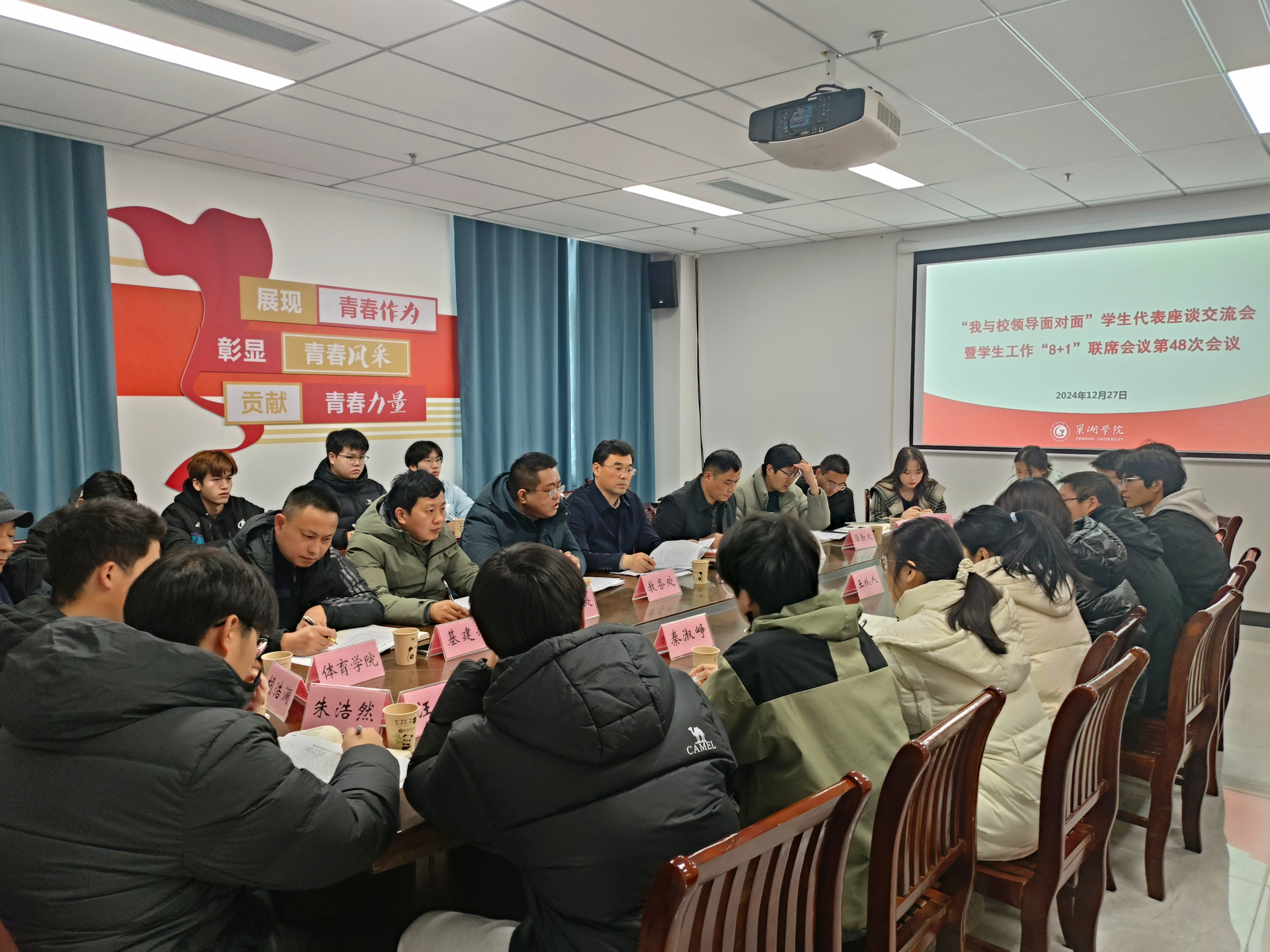 2024年12月27日,校黨委副書(shū)記宋立敏主持召開(kāi)“我與校領(lǐng)導(dǎo)面對(duì)面”學(xué)生代表座談交流會(huì)暨學(xué)生工作“8+1”聯(lián)席會(huì)議第48次會(huì)議。他從現(xiàn)場(chǎng)聽(tīng)取的問(wèn)題和意見(jiàn)建議談起,為同學(xué)們送上了一堂影響深刻的思政課。宋立敏首先認(rèn)真聽(tīng)取了參會(huì)學(xué)生反映的問(wèn)題和提出的意見(jiàn)建議,接著充分肯定了他們對(duì)學(xué)校發(fā)展建設(shè)和自身成長(zhǎng)成才的關(guān)心,希望大家能夠以“主人翁”的姿態(tài)更多地參與到學(xué)校民主管理和各項(xiàng)事業(yè)發(fā)展中來(lái),真正做到自我教育、自我管理、自我服務(wù)。最后,他對(duì)同學(xué)們提出了三點(diǎn)期望:一是好好學(xué)習(xí),健康成長(zhǎng),努力成為黨和國(guó)家的有用之才。努力學(xué)習(xí),營(yíng)造良好學(xué)風(fēng),提升校園活力,為校園增光添彩,勇?lián)聲r(shí)代賦予大學(xué)生的重要責(zé)任與使命;二是珍惜時(shí)光,用好平臺(tái),更好地提升自己主宰未來(lái)的能力和素質(zhì)。充分利用好學(xué)校的平臺(tái),德智體美勞全面發(fā)展,全方位提升自身綜合素質(zhì);三是管好自己,養(yǎng)成習(xí)慣,用自己的正能量影響身邊人。要從一點(diǎn)一滴的小事做起,養(yǎng)成良好習(xí)慣,形成良好的示范帶頭作用。