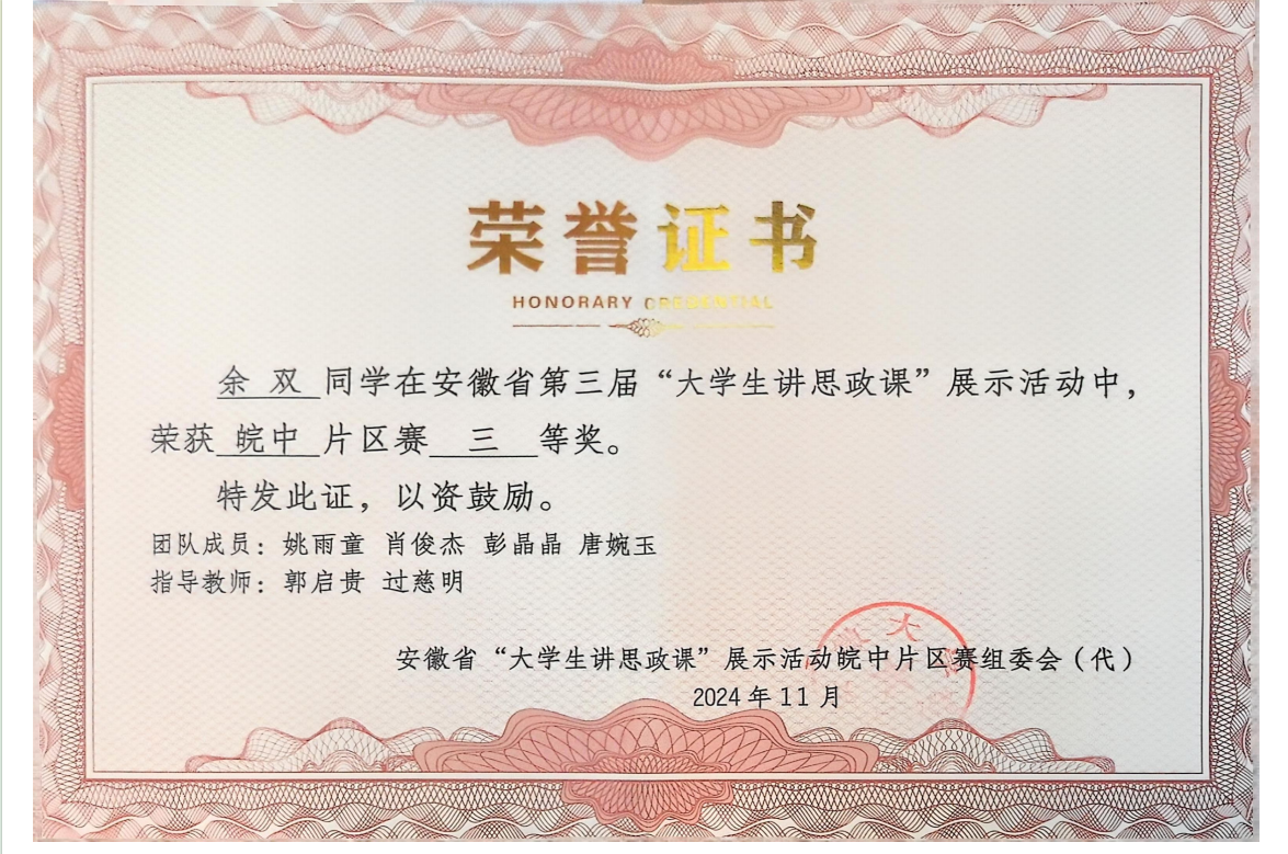 郭啟貴教師指導余雙團隊在安徽省第三屆“大學生講思政課”展示活動中榮獲三等獎