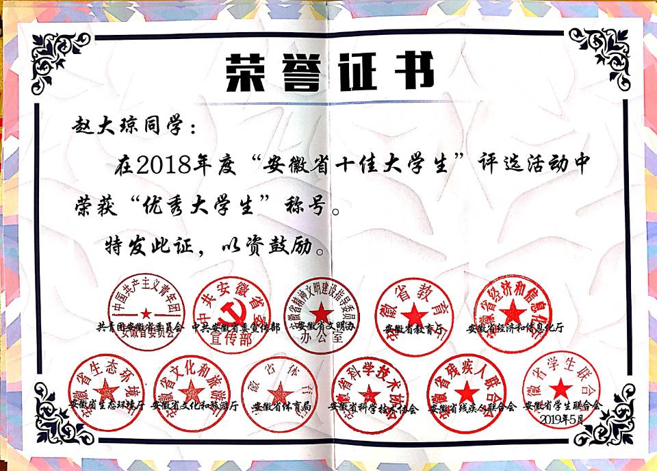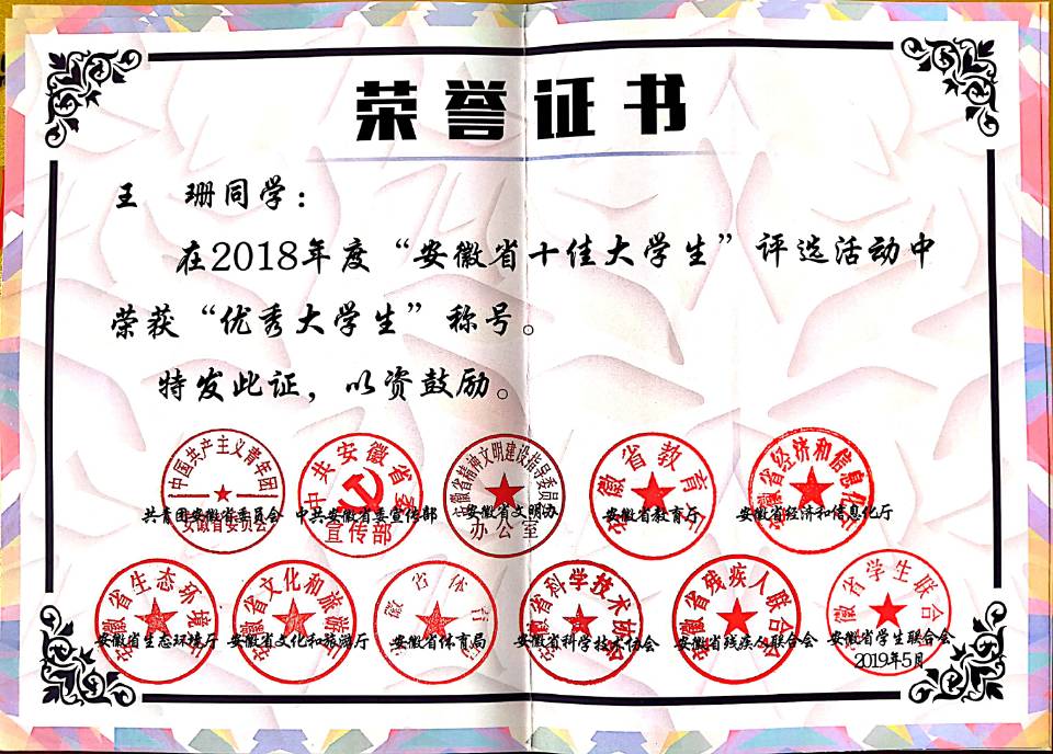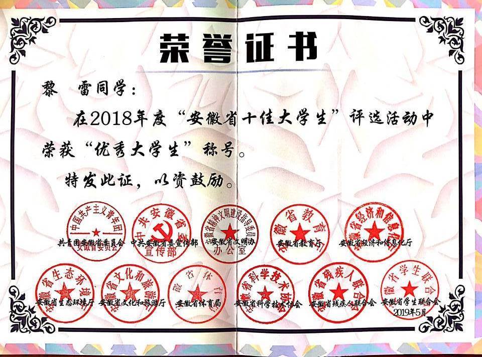 2018年度“安徽省十佳大學生”評選榮譽證書