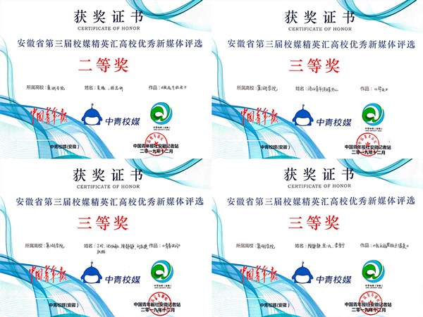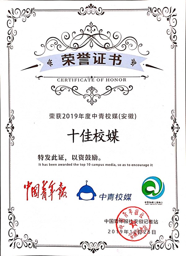 第三屆安徽校媒精英匯獲獎證書和“十佳校媒”榮譽證書