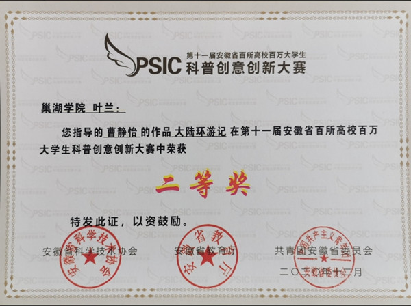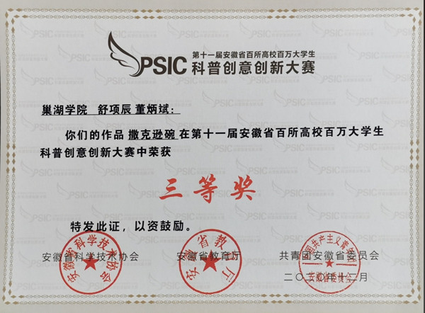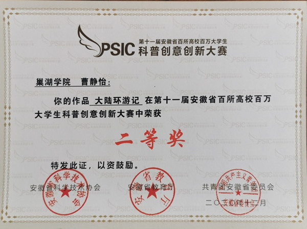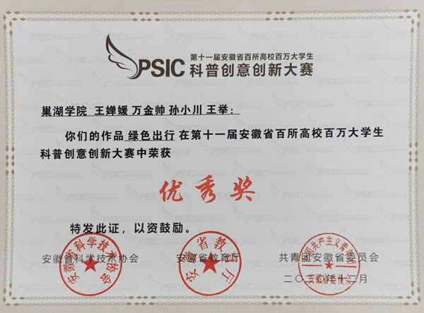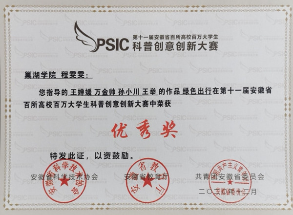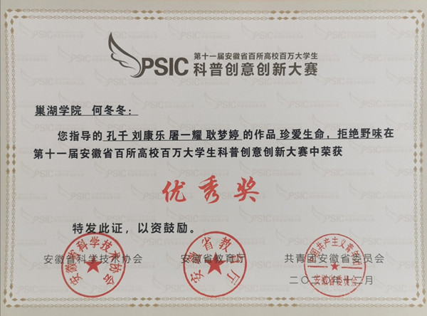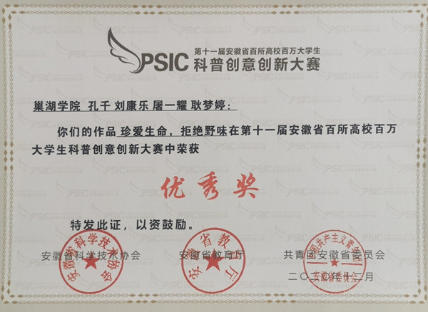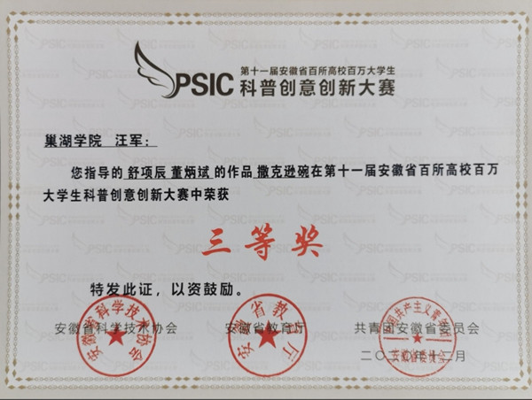 第十一屆安徽省百所高校百萬大學生科普創意創新大賽獲獎證書