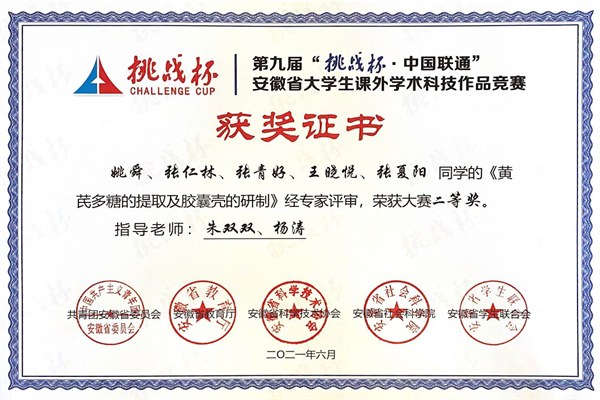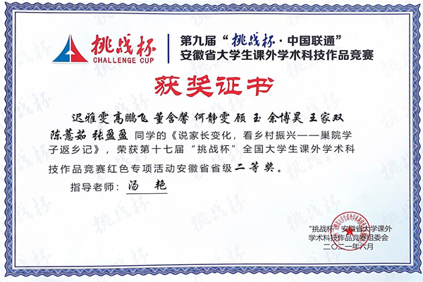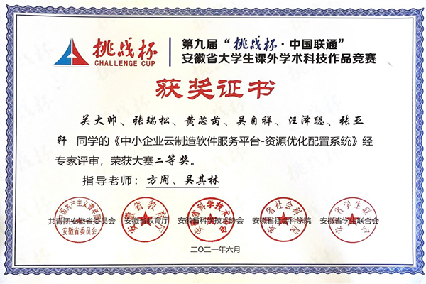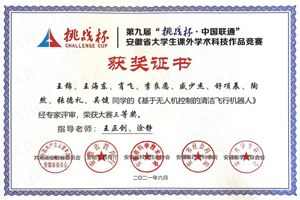 第九屆“挑戰杯·中國聯通”安徽省大學生課外學術科技作品競賽獲獎證書
