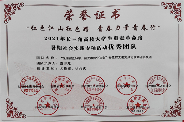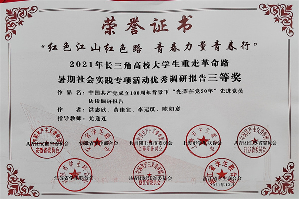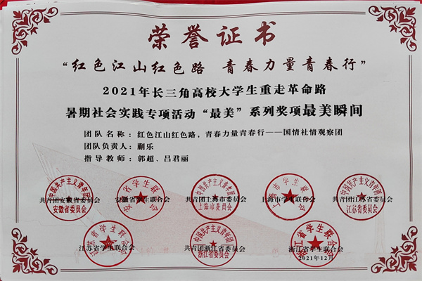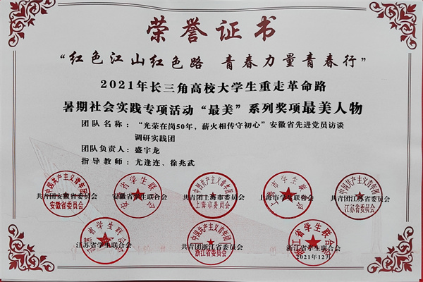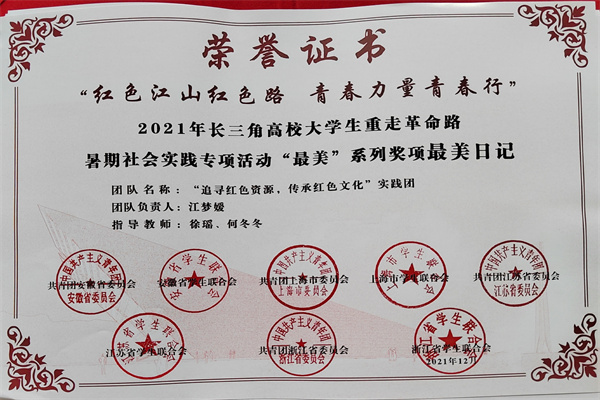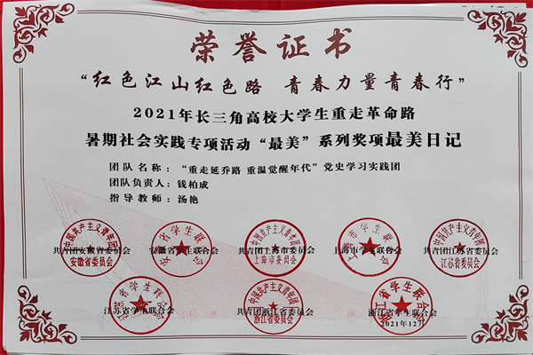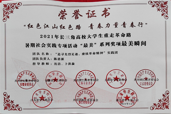 “紅色江山紅色路 青春力量青春行”2021年長三角高校大學生重走革命路暑期社會實踐專項活動最美系列獎項榮譽證書