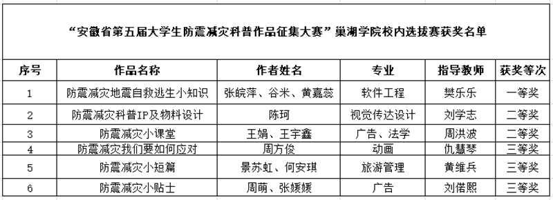 為做好安徽省第五屆大學生防震減災科普作品征集大賽的作品遴選與推薦工作,普及大學生防震減災科普知識,提升大學生防震減災意識,校團委自2023年5-8月開展安徽省第五屆大學生防震減災科普作品征集大賽巢湖學院選拔賽。遵循公開、公平、公正的原則,依據專家評審結果,現將獲獎名單進行公示。