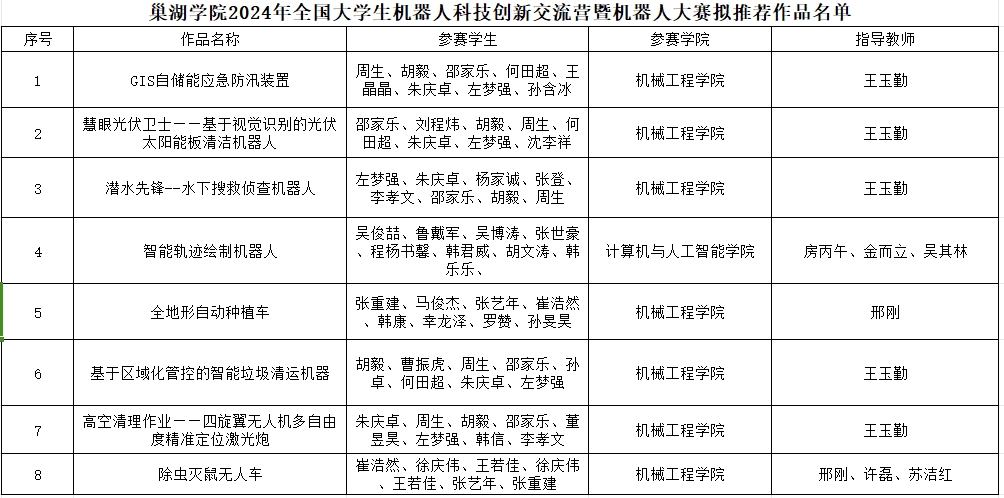 遵循公開、公正、公平的原則,經前期宣傳動員、院級初審推薦、校團委評審,現將巢湖學院2024年全國大學生機器人科技創新交流營暨機器人大賽推薦作品名單予以公示。