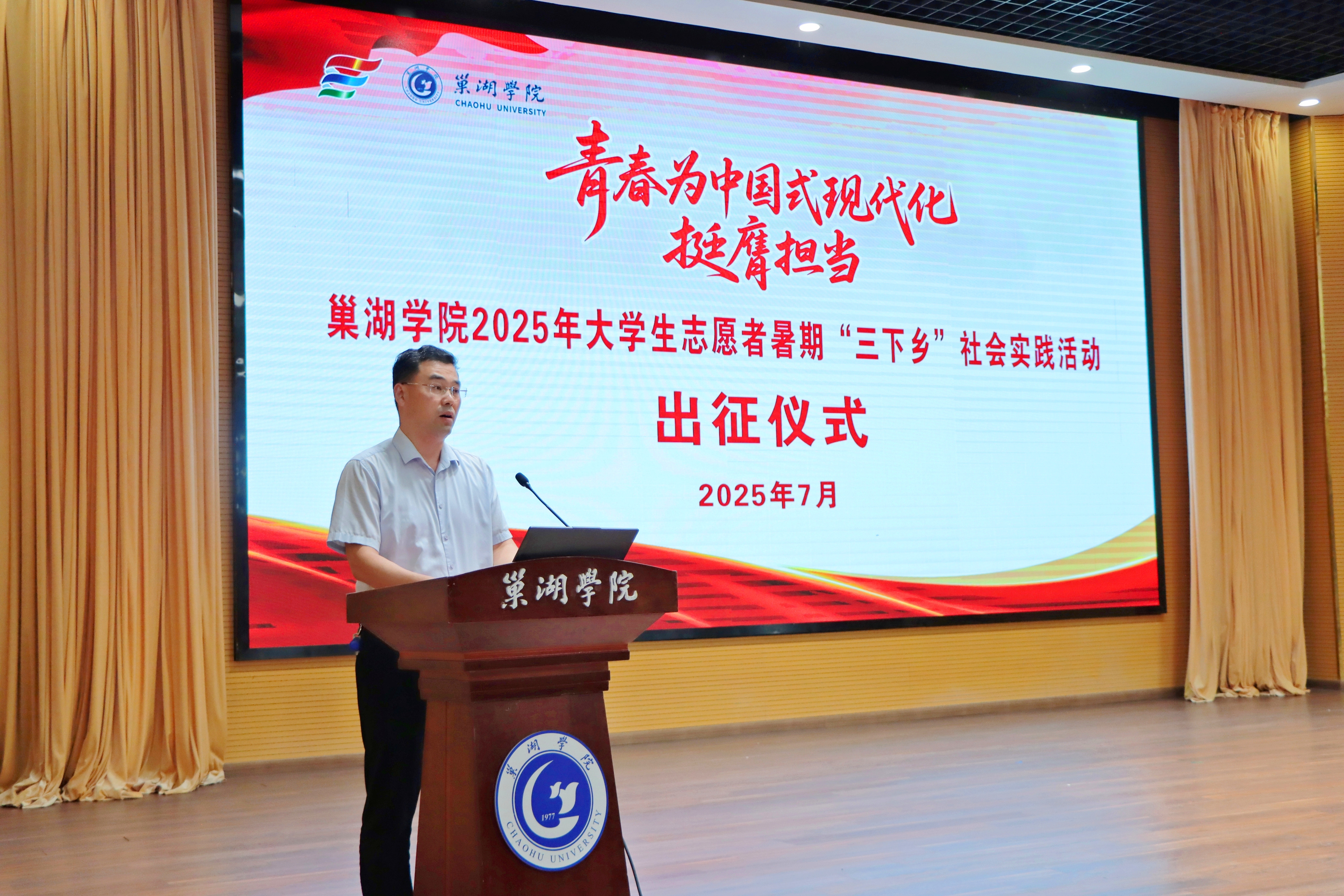 宋立敏講話并宣布巢湖學院2025年大學生志愿者暑期“三下鄉”社會實踐活動全面啟動,他指出今年是全面貫徹習近平總書記考察安徽重要講話精神的關鍵之年,恰逢中國共產黨成立104周年、中國人民抗日戰爭暨世界反法西斯戰爭勝利80周年,具有特殊的歷史意義和時代內涵,他對即將出征的全體志愿者提出四點希望:一是感悟思想偉力,熔鑄忠誠之魂。將個人成長融入國家發展大局,在實踐中深刻感悟習近平新時代中國特色社會主義思想的真理力量和實踐偉力;二是投身火熱實踐,激揚奉獻之歌。發揚“自找苦吃”的精神,用專業知識、青春智慧,在成就觀察、教育關愛、文化服務、科技助農等廣闊領域,發光發熱;三是錘煉過硬本領,閃耀青春之光。珍惜實踐機會,在克服困難中提升溝通、協作、創新和解決問題的能力;四是講好奮斗故事,匯聚前行之力。用心觀察、勤于思考,用筆觸和鏡頭,記錄感人的實踐瞬間。最后,宋立敏叮囑大家一定要堅持安全第一的原則,自覺遵紀守法,聽從指揮,充分研判天氣變化和自然地質條件等,安全有序地開展社會實踐活動。
