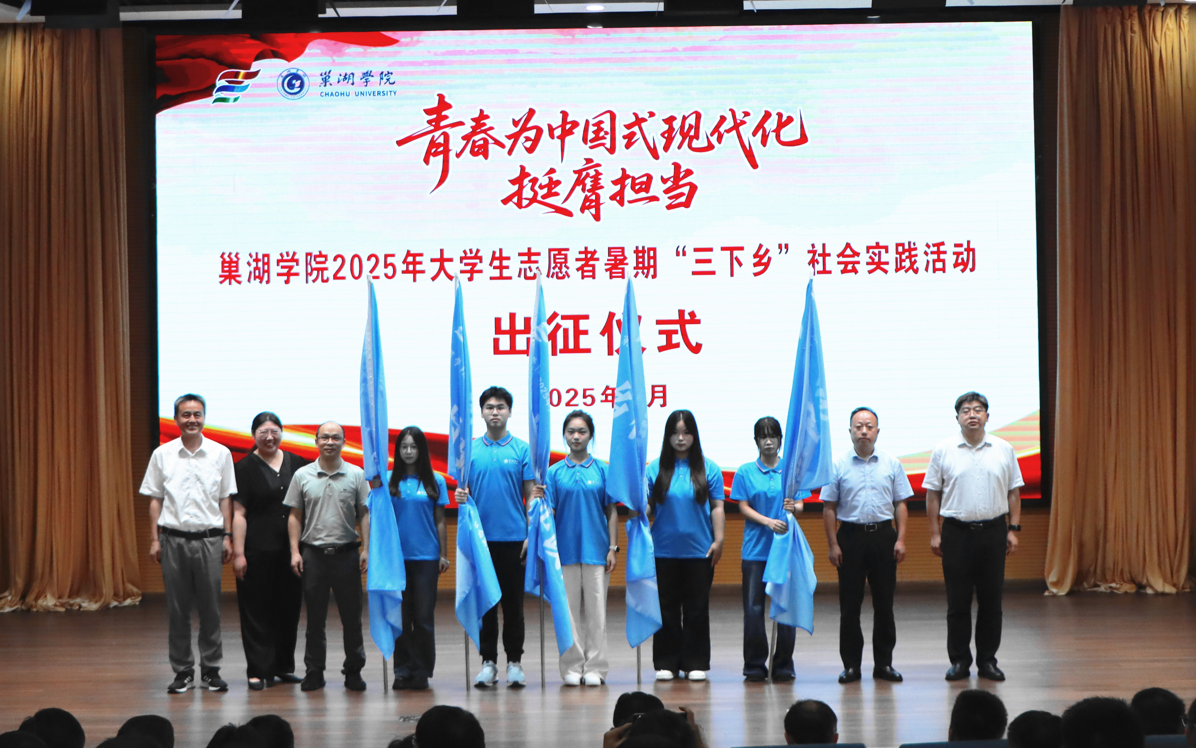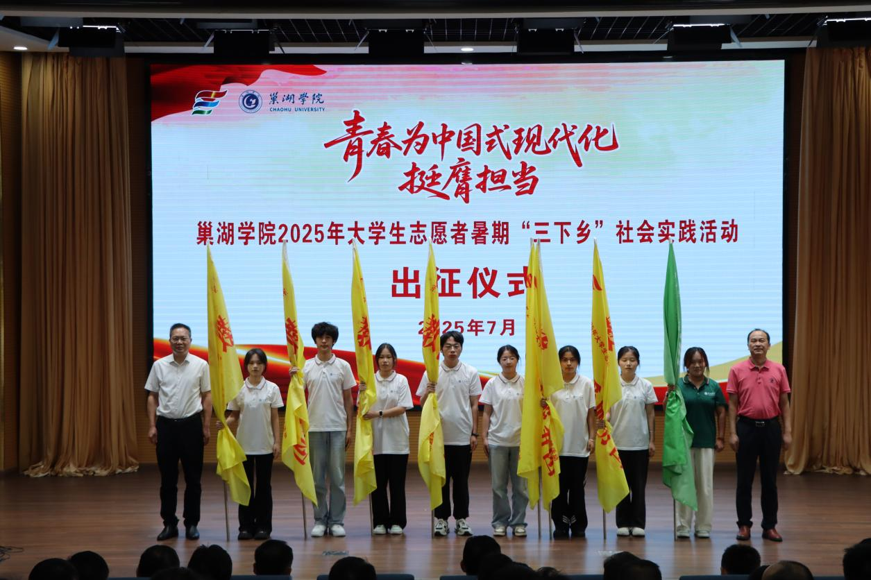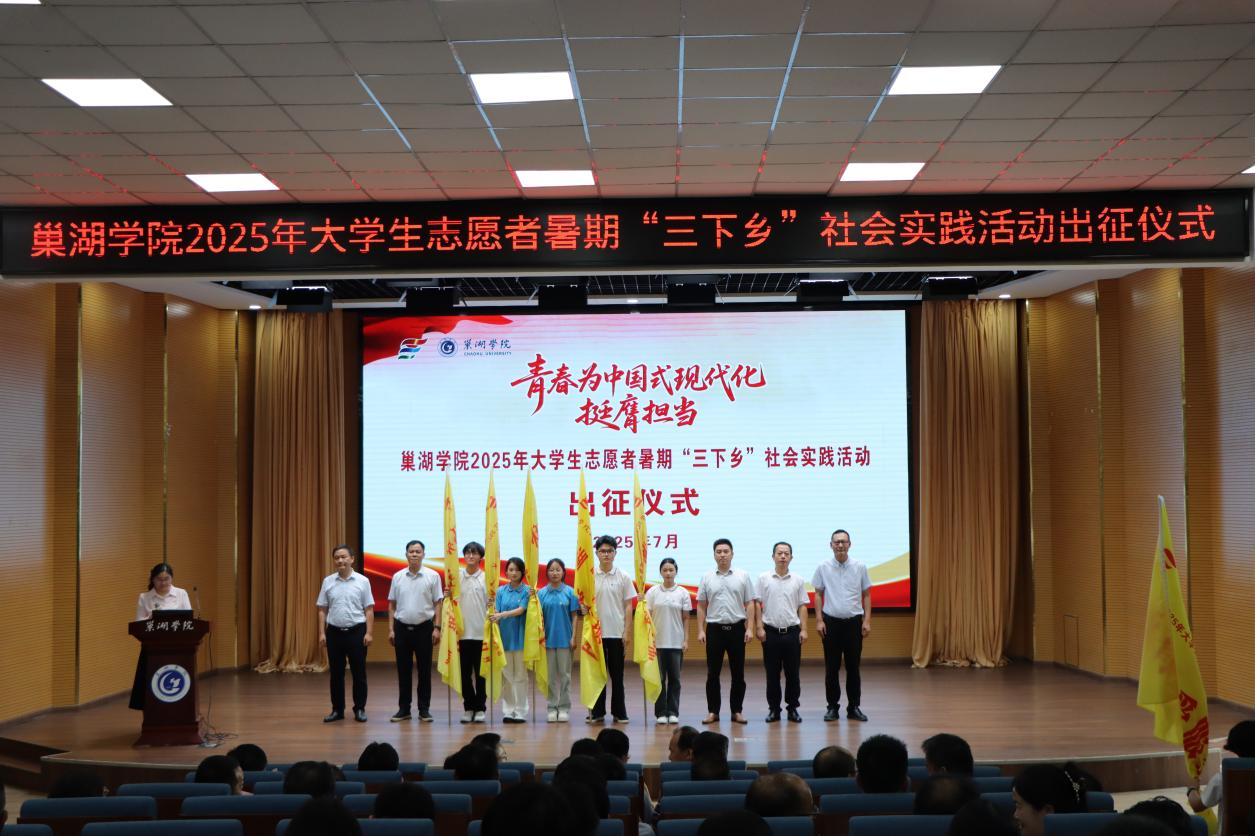 7月1日下午,巢湖學院在求實樓報告廳舉行2025年大學生志愿者暑期“三下鄉”社會實踐活動出征儀式。校黨委副書記宋立敏,校黨委委員、組織部部長柯應根,校黨委委員、宣傳部部長張連福,辦公室、學工部、保衛部、教務處、后勤處等相關部門負責人,各學院黨委書記、副書記、團委書記、校級及以上重點團隊指導教師和學生代表350余人參加。儀式由校團委書記王倩主持。