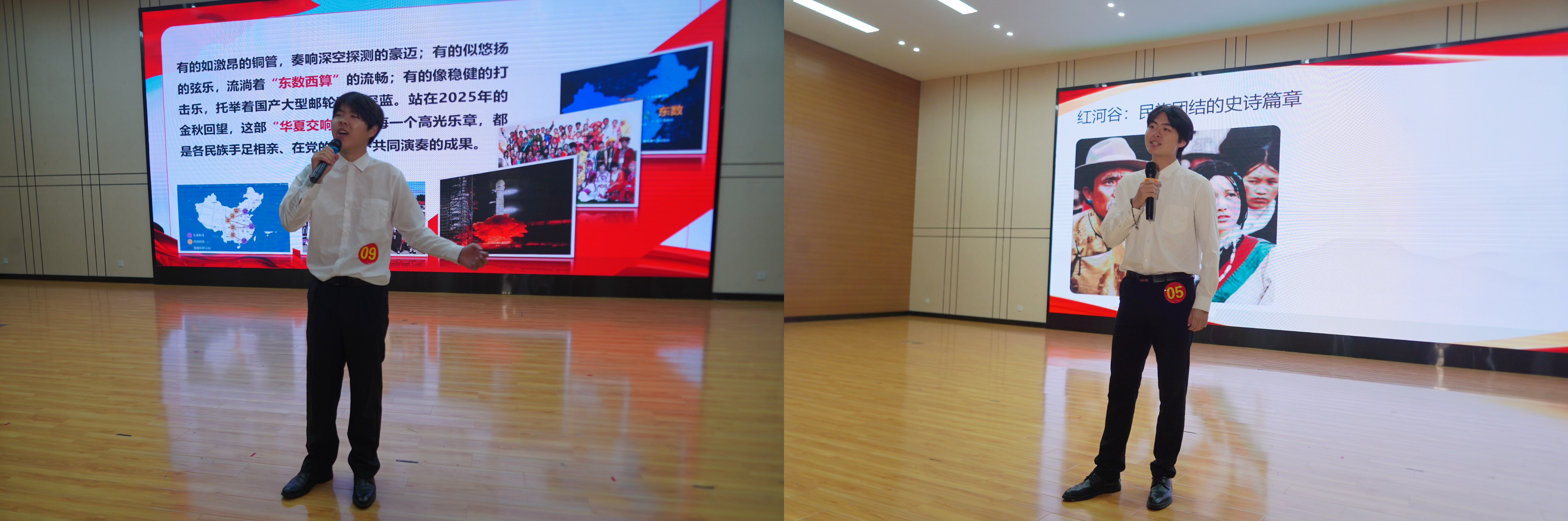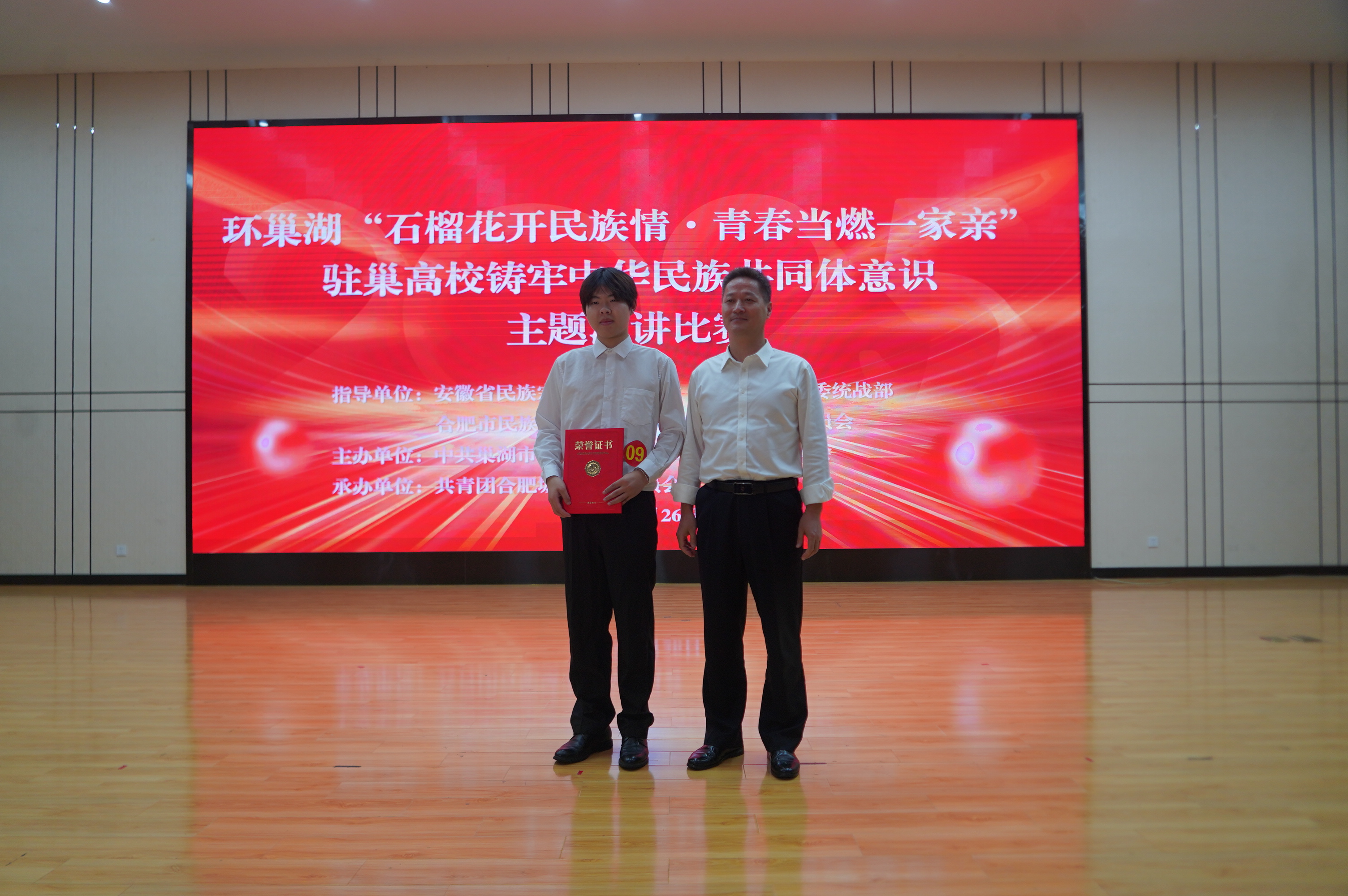 決賽現場,我校黃佳佳同學以《同譜華夏交響樂 共筑團結新篇章》為題,結合自己所學專業,把國家的發展比作一部恢弘的交響樂,56個民族是其中不可或缺的聲部,每個人都是新時代“交響樂”的演奏者。他認為,鑄牢中華民族共同體意識,不是遙遠的口號,而是每個人演奏好每一個音符的責任——既要守護好自己民族的獨特音色,也要學會與其他“聲部”和諧共鳴。肖炳祥同學則以一部歷史電影《紅河谷》為切入點,結合巢湖以展演融多俗、景區傳認同、社區創示范,繪就民族團結盛景的鮮活事例,闡述了民族團結不僅是中華民族千百年來的精神財富,更是國家繁榮昌盛的穩固基石,各民族要像石榴籽一樣緊緊相依。經過激烈角逐,最終,我校黃佳佳、肖炳祥2位同學分別榮獲特等獎(全場唯一)、二等獎的好成績,充分展現了我校學子優良的綜合素養和昂揚的精神風貌,更體現了新時代青年深厚的家國情懷,贏得了評委與觀眾的廣泛共鳴和認可。