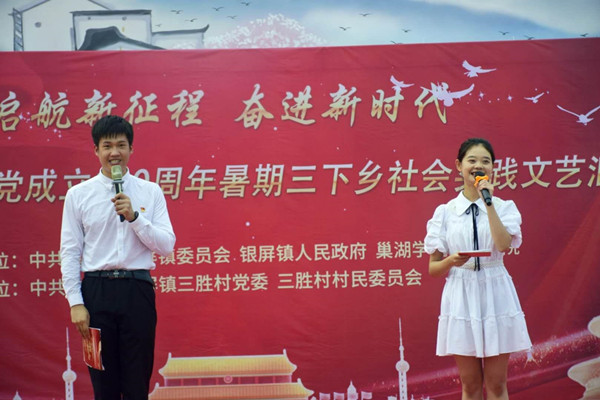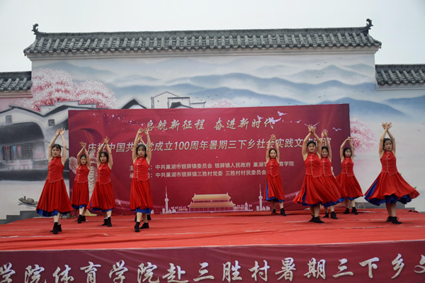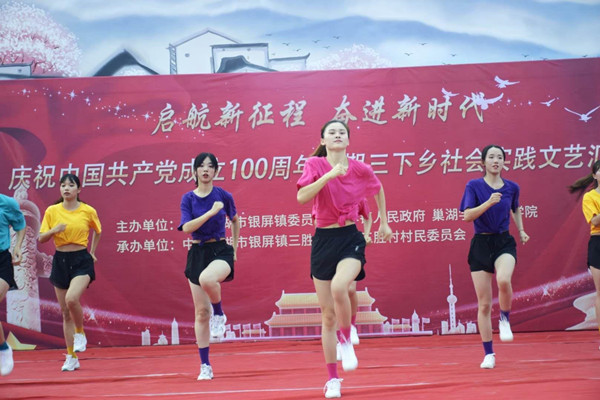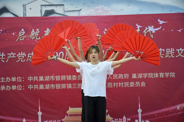 為慶祝中國共產黨百年華誕,積極推進“我為群眾辦實事”實踐活動走深走實,進一步深化服務鄉村文化振興建設,做好做實“三全育人”工作,強化黨組織對青年學生的凝聚力與感召力,7月6日晚,體育學院黨委聯合中共巢湖市銀屏鎮委員會、銀屏鎮人民政府,在銀屏鎮三勝村文化中心廣場共同組織開展了主題為“奮斗百年路 啟航新征程”慶祝中國共產黨成立100周年文藝演出活動,體育學院部分教師及學生黨員、團員青年共計百余名參與本次演出。
