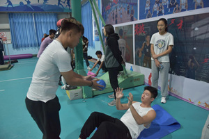 第四屆社會體育指導與管理專業(yè)學生基本功大賽在學期初就開始籌備,滿進前老師對各參賽班級進行了針對性的指導,輔導員組織班級學生每周進行集體訓練,各參賽選手準備充分。大賽項目設(shè)置參考全國健身教練職業(yè)技能大賽內(nèi)容,分為個人賽和團體賽兩部分。其中,個人賽包括沙袋過桿、“之”字型跑、健身球帶球爬行等項目,團體賽包括“團結(jié)一致”、“齊心協(xié)力”、“翻運輪胎”等項目。本屆大賽采用現(xiàn)場抽簽的方式,共有來自2020級社會體育指導與管理專業(yè)1班、2020級社會體育指導與管理專業(yè)2班、2021級社會體育指導與管理專業(yè)班、2022級社會體育指導與管理專業(yè)班4個班級,共計132名學生參賽,整場比賽輕松與激烈兼具、友誼與競技并存。