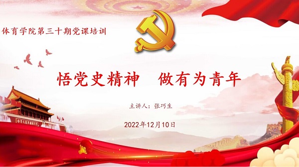 12月10日下午,體育學院學生第二黨支部書記張巧生為體育學院第三十期黨課培訓班的學員作題為“悟黨史精神,做有為青年”線上黨課培訓。體育學院第三十期黨課培訓班150余名黨的發展對象、入黨積極分子參加培訓。