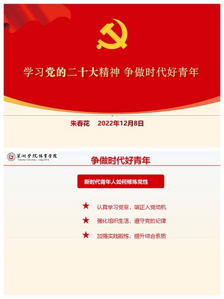 12月8日下午,體育學院黨委副書記朱春花為體育學院第三十期黨課培訓班的學員作題為“學習黨的二十大精神 爭做時代好青年”線上黨課培訓。體育學院第三十期黨課培訓班150余名黨的發展對象、入黨積極分子參加培訓。
