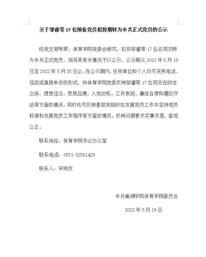 關于鄒睿等17位預備黨員擬按期轉為中共正式黨員的公示