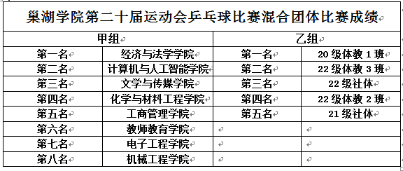 為傳承乒乓文化,發揚國球精神,6月11日,巢湖學院第二十屆校運會乒乓球比賽在校乒乓球館圓滿結束。此次競賽項目為混合團體賽,由巢湖學院舉辦,教務處、體育運動委員會承辦。來自13個二級學院和體育學院各班級,共計90多名運動員分別參加了甲組和乙組比賽,校乒乓球協會擔任了此次比賽的組織與裁判工作。