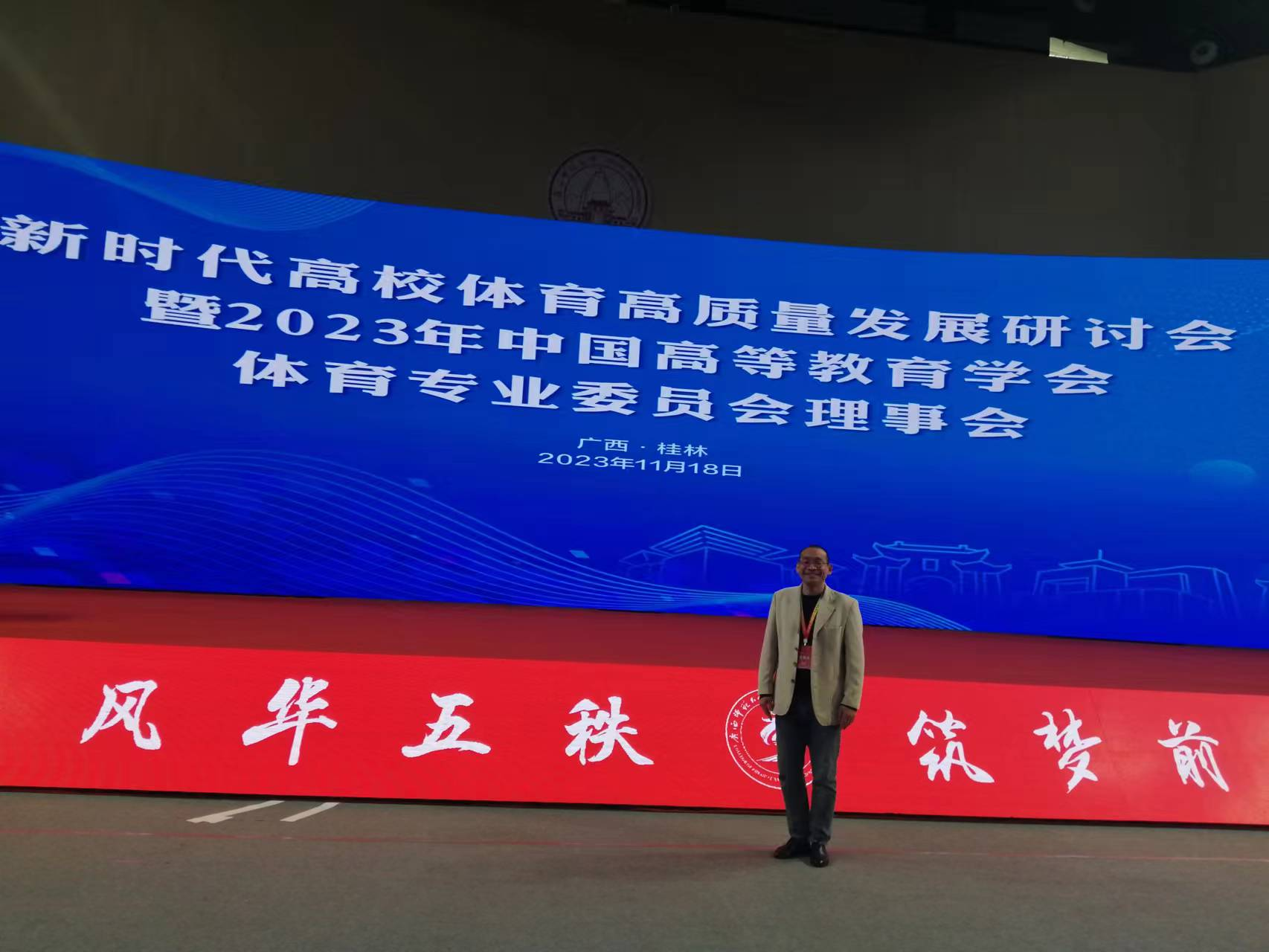 2023年11月17-19日,中國高等教育學會體育專業委員會(簡稱專委會)在廣西師范大學召開了新時代高校體育高質量發展研討會。專委會理事長李鴻江教授、秘書長駱秉全教授和全國九十余所高校體育院(系)負責人等共計百余人參加了會議。我院蘇家本教授代表巢湖學院體育學院參加會議。