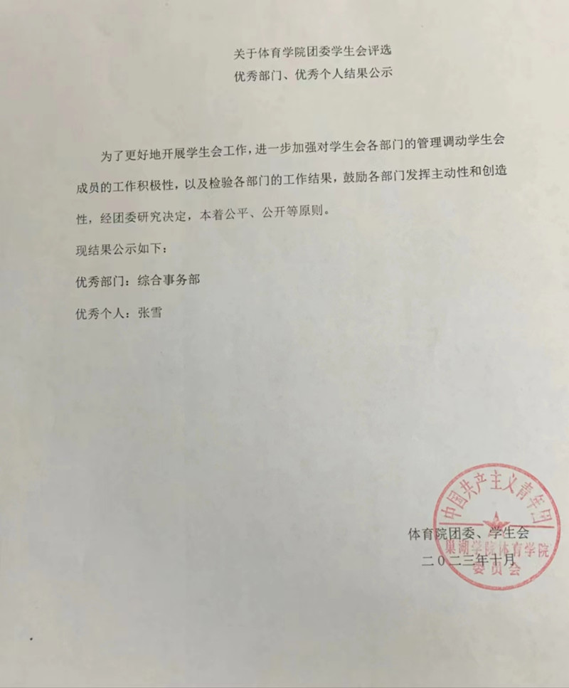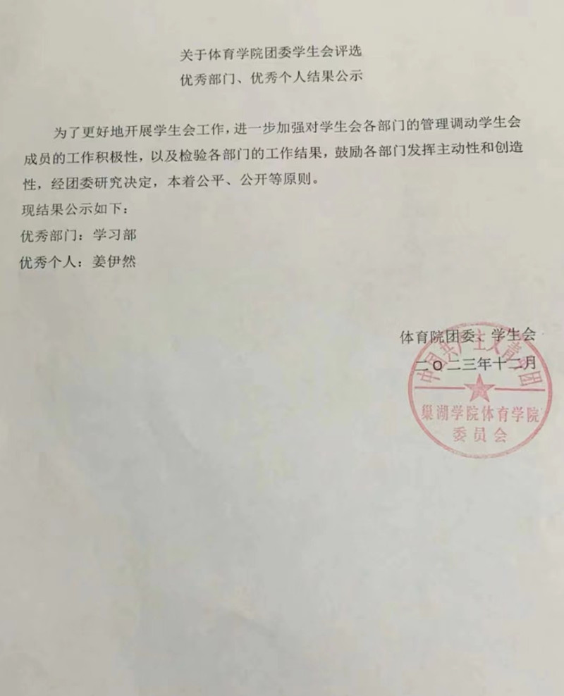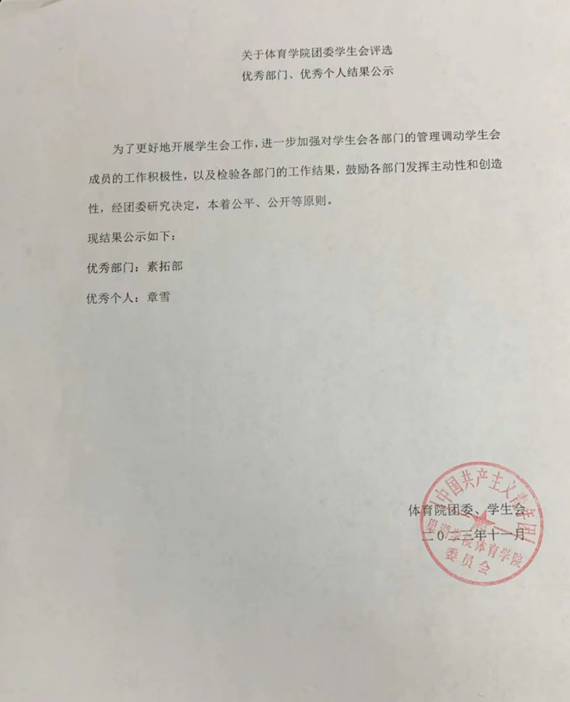 2023-2024學年第一學期體育學院學生會每月之星 、優秀部門評選情況公示