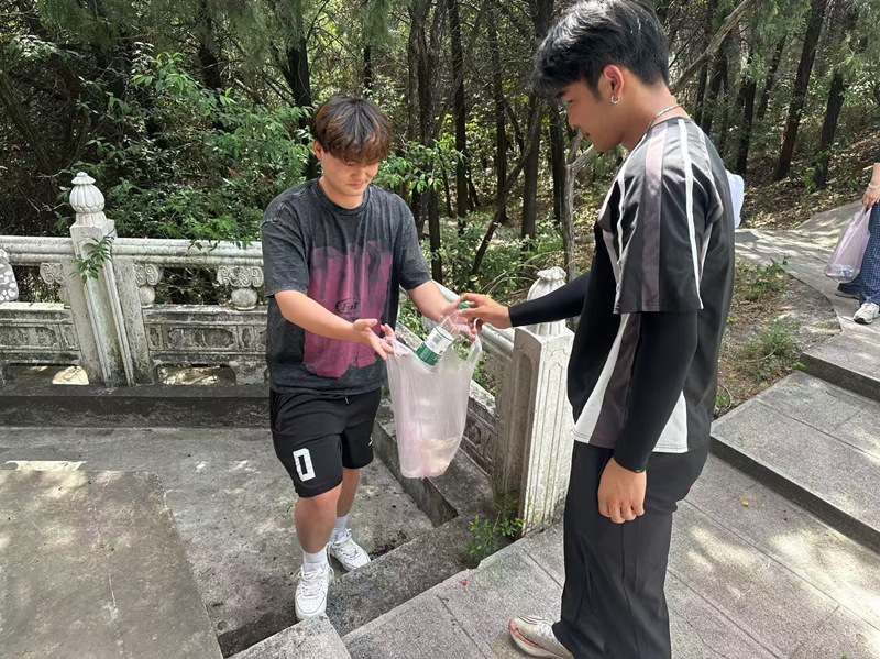 活動(dòng)伊始,院青年志愿者協(xié)會(huì)負(fù)責(zé)人李興凡向志愿者們?cè)敿?xì)介紹了活動(dòng)流程,重點(diǎn)強(qiáng)調(diào)了登山安全規(guī)范、垃圾分類(lèi)標(biāo)準(zhǔn)以及團(tuán)隊(duì)協(xié)作注意事項(xiàng),為活動(dòng)安全有序開(kāi)展奠定基礎(chǔ)。隨后,志愿者們開(kāi)始向山腳進(jìn)發(fā)。緊接著,在抵達(dá)山腳后,大家手持環(huán)保袋和垃圾鉗,分成三個(gè)小組沿登山路線向上清理。在陡峭路段,志愿者們自發(fā)結(jié)成“幫扶對(duì)子”,一邊相互扶持前行,一邊蹲身清理灌木叢、撿拾步道兩側(cè)的塑料瓶、食品包裝等廢棄物。“以前登山只顧著沖頂,這次我們放慢腳步,發(fā)現(xiàn)了不一樣的風(fēng)景。”2023級(jí)體育教育專(zhuān)業(yè)學(xué)生王同學(xué)邊說(shuō)邊用長(zhǎng)夾將石縫中的塑料瓶撿起。