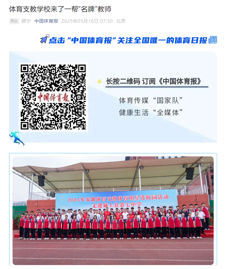 5月15日,安徽省潁上縣第七中學(xué)迎來了一場意義非凡的體育盛會——由國家體育總局青少年體育司指導(dǎo),安徽省體育局、省教育廳、共青團安徽省委聯(lián)合主辦的“2025年體育支教志愿服務(wù)冠軍進校園活動”在此舉行。巢湖學(xué)院體育學(xué)院選派的20名支教學(xué)生,以扎實的專業(yè)能力和教育熱忱,成為活動中的焦點。此次活動中,許海峰、張常寧、朱雪瑩等7位奧運冠軍及體壇名將首次集體走進支教一線,不僅為鄉(xiāng)村青少年點燃體育夢想,更以行業(yè)頂尖標(biāo)準(zhǔn)對巢湖學(xué)院支教團隊的教學(xué)成果給予高度評價,充分體現(xiàn)了我校體育人才培養(yǎng)模式獲得國家級認(rèn)可。支教活動受到中央電視臺CCTV-5、人民日報、新華社、中國體育報、安徽省體育局、安徽學(xué)聯(lián)等多家媒體宣傳報道。