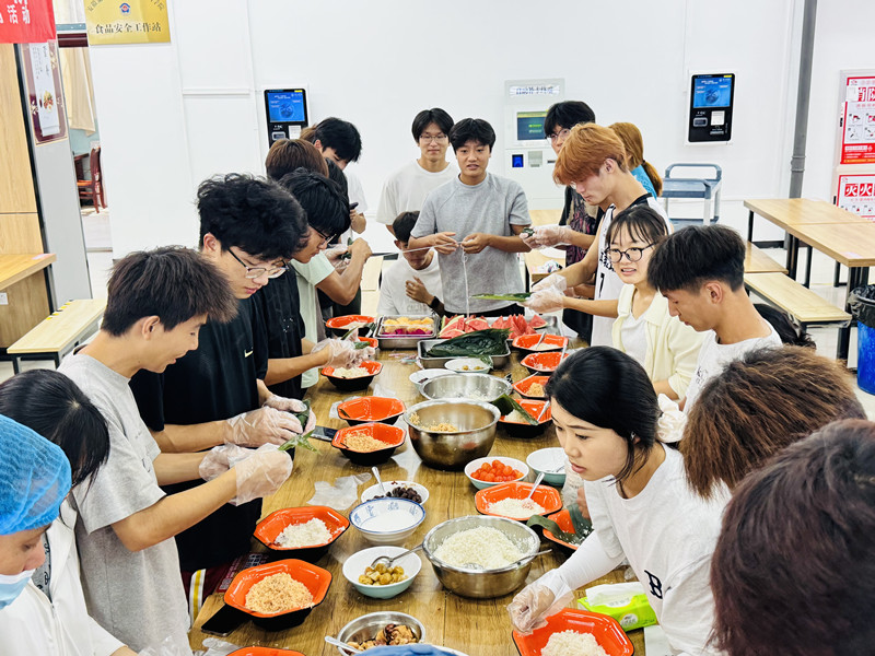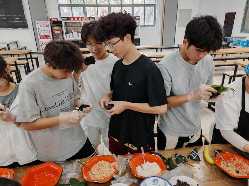 活動現場,學生早早準備好了糯米、粽葉、紅棗、紅豆等食材,學生黨員和團員們圍在一起,紛紛動手嘗試包粽子。大家有的手法熟練,迅速將粽葉卷成漏斗狀,填入糯米和餡料,再用棉線緊緊捆扎;有的則是第一次包粽子,略顯笨拙,在食堂工作人員的耐心指導下,逐漸掌握了技巧。折葉、填米、包裹、捆繩,一個個形態各異的粽子在大家的手中誕生。