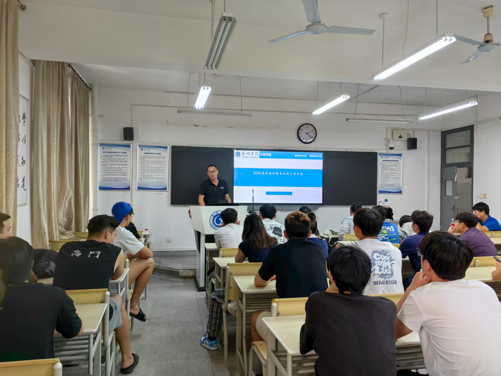 9月3日下午,體育學(xué)院在博學(xué)樓102教室舉行2026屆社會(huì)體育指導(dǎo)與管理和運(yùn)動(dòng)訓(xùn)練專業(yè)實(shí)習(xí)動(dòng)員大會(huì),副院長(zhǎng)楊葉紅、社會(huì)體育指導(dǎo)與管理專業(yè)負(fù)責(zé)人蘇家本、運(yùn)動(dòng)訓(xùn)練專業(yè)負(fù)責(zé)人李靖、輔導(dǎo)員張巧生、全體實(shí)習(xí)指導(dǎo)老師以及2026屆兩個(gè)專業(yè)全體學(xué)生參加了會(huì)議。會(huì)議由楊葉紅主持。