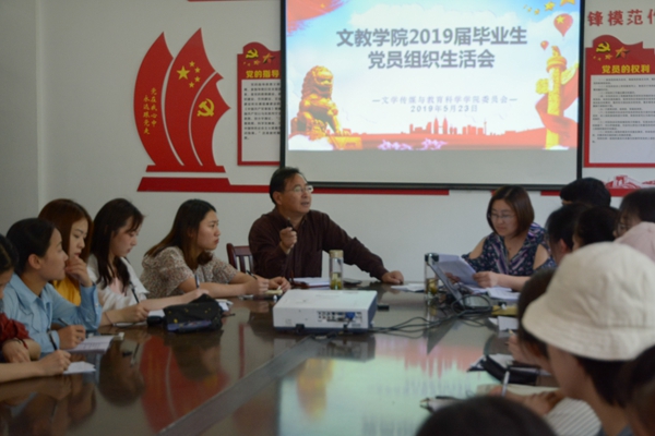 為進一步增強黨組織的戰斗力和凝聚力,加強基層黨的建設,發揮畢業生黨員在畢業季先鋒模范作用。根據校黨委的安排部署。5月23日中午,文教學院分黨委于敏行樓二樓黨員活動室召開2019屆畢業生黨員專題黨課暨組織生活會。文教學院黨委書記朱玉票、副書記王倩出席會議,會議由學生第一支部書記曾鵬主持,文教學院2019屆全體畢業生黨員參會。