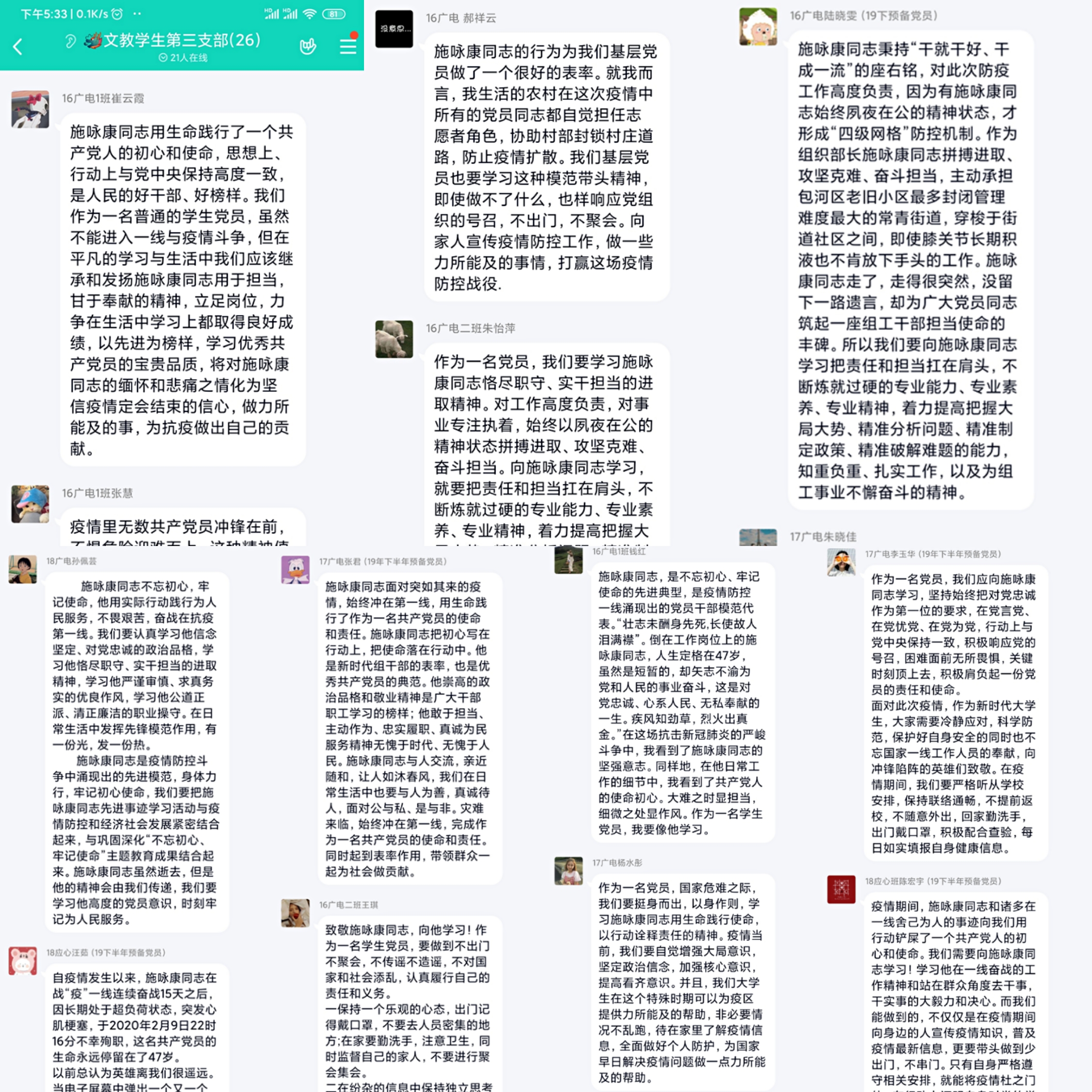 會議伊始,沈潔同志向支部黨員傳達(dá)了省委組織部和學(xué)校下發(fā)的向施詠康同志學(xué)習(xí)的通知,闡明會議主題。而后,沈潔帶領(lǐng)學(xué)生黨員共同學(xué)習(xí)施詠康同志在疫情防控一線的先進(jìn)事跡,要求全體黨員深刻領(lǐng)悟其崇高精神,并結(jié)合自身情況,談學(xué)習(xí)的收獲以及體會。沈潔首先表示,防疫期間將繼續(xù)帶領(lǐng)支部全體黨員積極構(gòu)筑疫情防控堡壘,在疫情防控阻擊戰(zhàn)中充分發(fā)揮基層黨組織戰(zhàn)斗堡壘作用和共產(chǎn)黨員先鋒模范作用。20余名學(xué)生黨員緊跟其后,踴躍發(fā)言,從實際學(xué)習(xí)和生活中談自身感悟和努力方向。沈潔同志號召支部全體黨員:要以施詠康同志為榜樣,防疫期間時刻保持黨員意識,在學(xué)習(xí)、工作和生活上努力發(fā)揮共產(chǎn)黨員的先鋒模范作用。