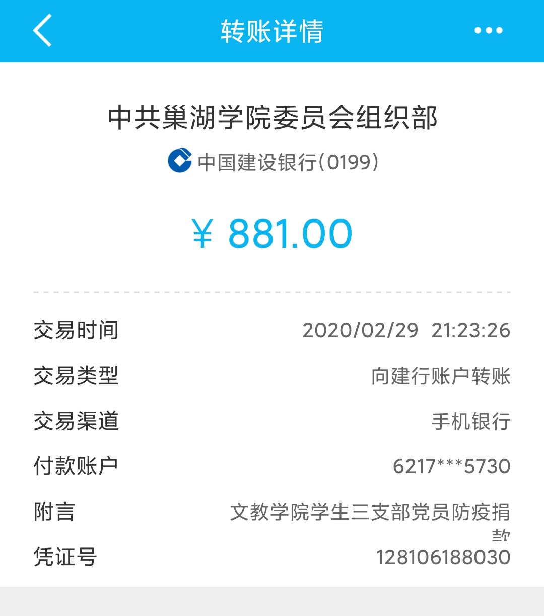 最后,沈潔對支部為防疫工作捐款情況進(jìn)行公示。學(xué)生第三支部全體黨員自愿捐款支持新冠肺炎疫情防控工作,為奮戰(zhàn)在防疫抗疫一線的工作人員、困難群眾及犧牲人員家屬等共捐款881元,希望能夠早日打贏這場疫情防控阻擊戰(zhàn)。