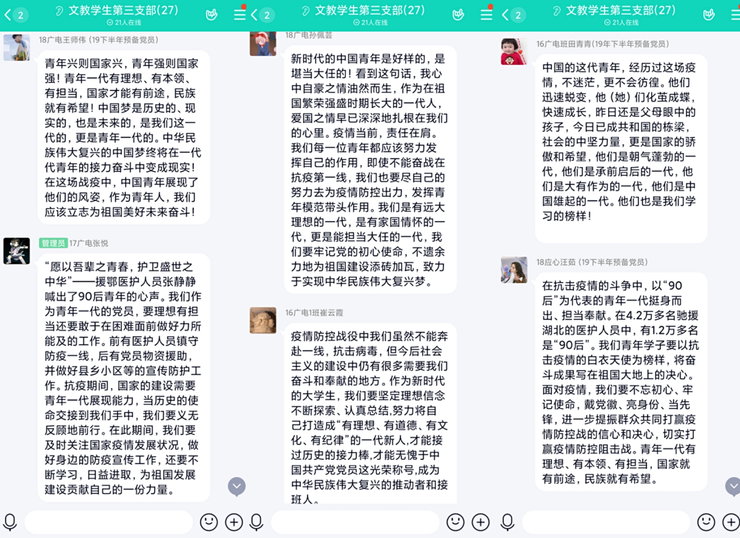 4月21日,文教學院學生第三黨支部召開支部大會,學習習近平總書記給北京大學援鄂醫療隊全體“90后”黨員的回信精神,討論2020年上半年黨員發展事宜。會議由支部書記沈潔主持,全體學生黨員參會。