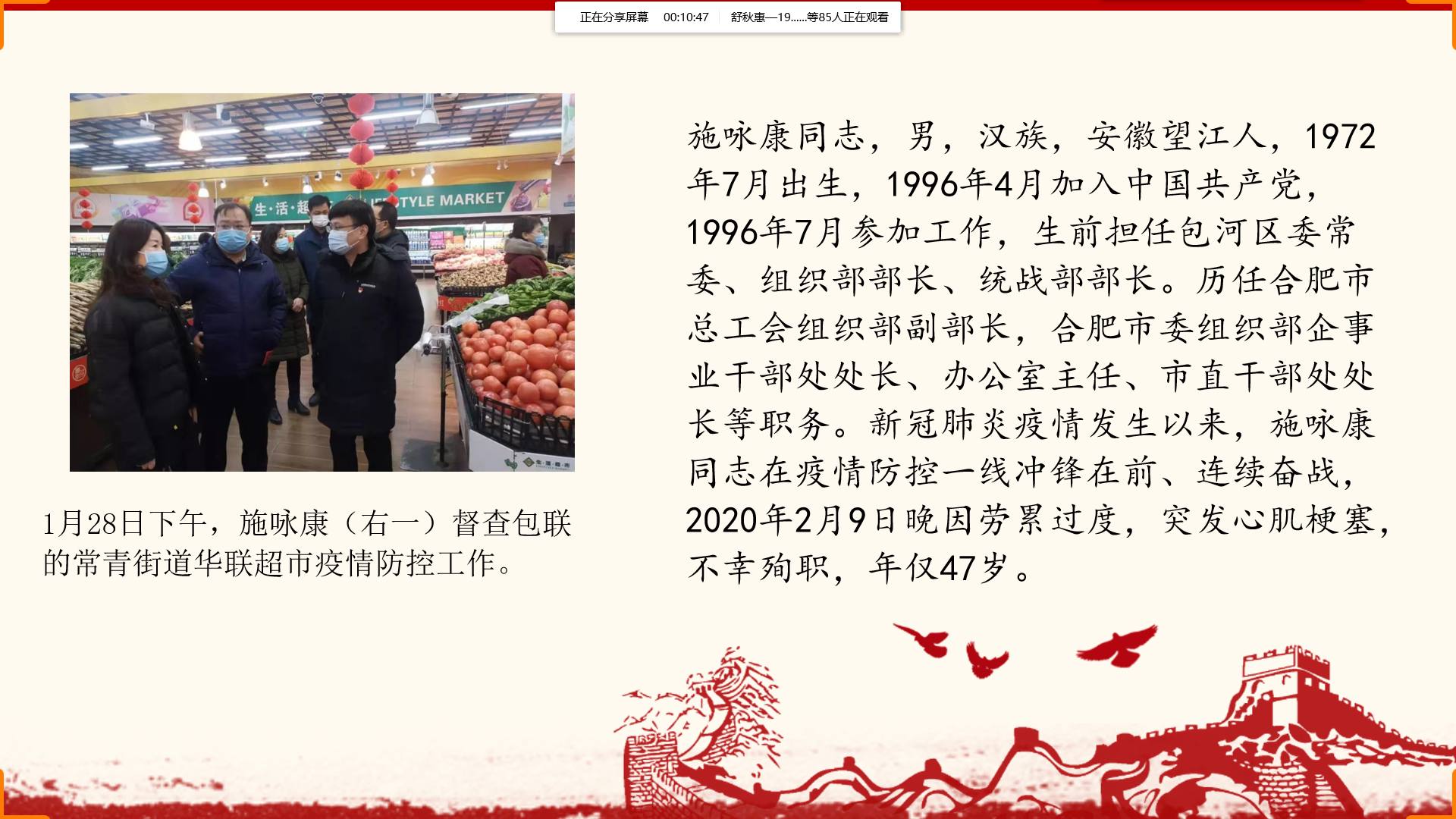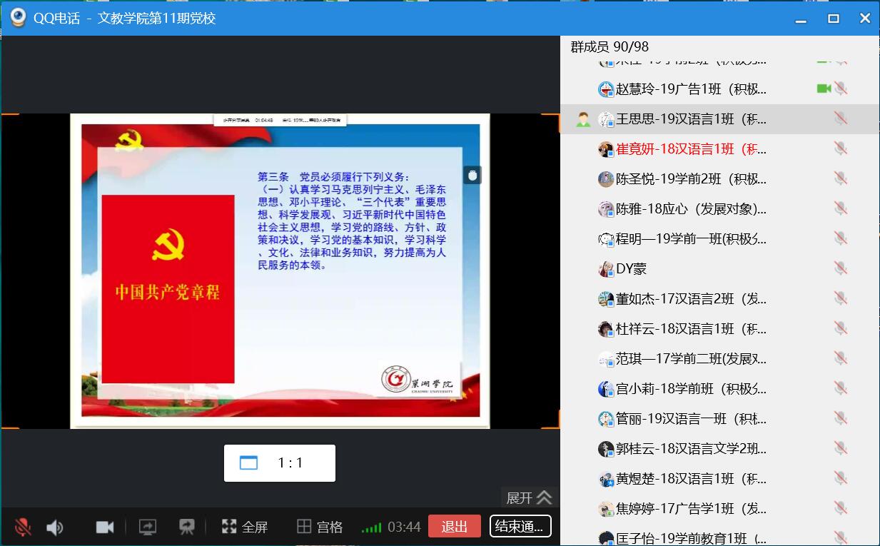 開班之前,班主任曾鵬就本期業(yè)余黨校的籌備情況,包括課程安排、紀(jì)律要求和考核方式等進(jìn)行介紹。學(xué)院黨委書記朱玉票通過視頻課堂進(jìn)行了開班講話,并宣布文教學(xué)院第十一期業(yè)余黨校正式開班。隨后,朱玉票開始題為“端正入黨動(dòng)機(jī),努力成為一名合格黨員”的開班第一課。他圍繞“中國(guó)共產(chǎn)黨是個(gè)什么樣的政黨”“為什么要加入中國(guó)共產(chǎn)黨”“怎樣才能加入中國(guó)共產(chǎn)黨”三個(gè)問題給學(xué)員們系統(tǒng)講述了黨的性質(zhì)宗旨和奮斗目標(biāo),通過黨史回顧和對(duì)新時(shí)代共產(chǎn)黨人的初心和使命的分析講解,明確了“只有為實(shí)現(xiàn)共產(chǎn)主義、全心全意為人民服務(wù)”才是唯一正確的入黨動(dòng)機(jī)。朱書記在課上強(qiáng)調(diào),組織上入黨一生一次,思想上入黨一生一世,勉勵(lì)學(xué)員們認(rèn)真居家防疫,積極主動(dòng)學(xué)習(xí),在今后的學(xué)習(xí)、工作和生活中按黨員標(biāo)準(zhǔn)嚴(yán)格要求自己,苦練自身本領(lǐng),接受組織考驗(yàn),積極發(fā)揮模范帶頭作用,爭(zhēng)取早日入黨。
