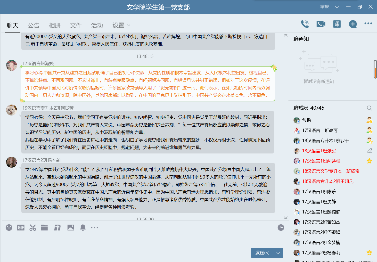 不忘初心、牢記使命。學生第一黨支部一直重視支部思想建設,疫情發生以來積極通過各種方式加強黨的知識學習,提高支部成員理論素養,鼓勵支部成員投身實踐,化知識為力量,與時俱進,勇創佳績。(文/張梁 審/朱玉票)