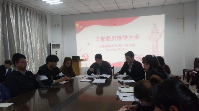 2021年3月19日18時(shí),文教學(xué)院學(xué)生第一黨支部在敏行樓召開了支部選舉會(huì)議,選舉產(chǎn)生支部副書記、紀(jì)檢委員、組織委員、宣傳委員。本次會(huì)議由支部書記曾鵬主持,應(yīng)到黨員51人,實(shí)到51人。其中正式黨員26人全部到齊。