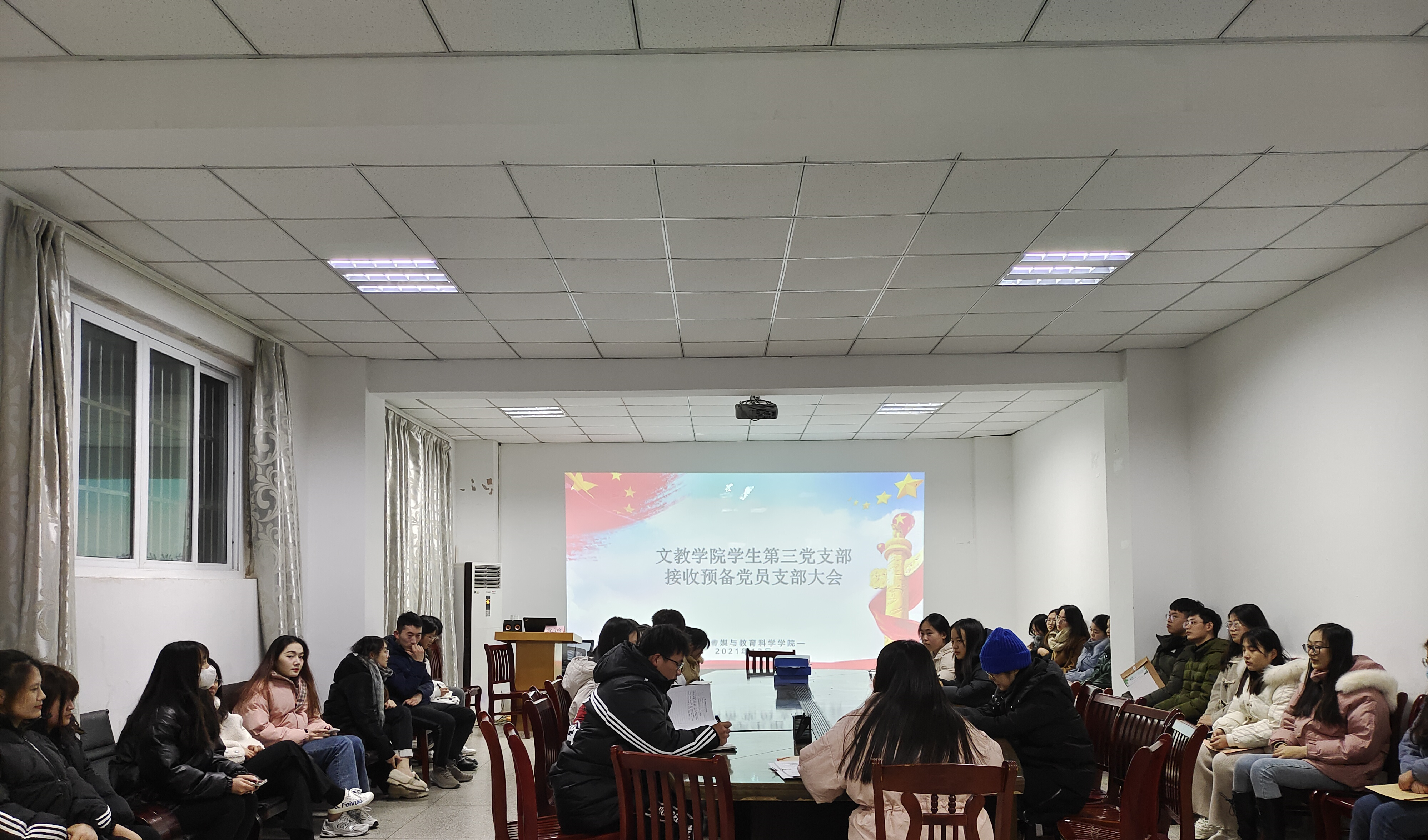 根據支部黨員發展工作安排,2021年12月15日,文教學院學生第三黨支部在敏行樓會議室召開接收發展對象為預備黨員會議。本次會議由支部書記沈潔主持,支部黨員同志積極與會。
