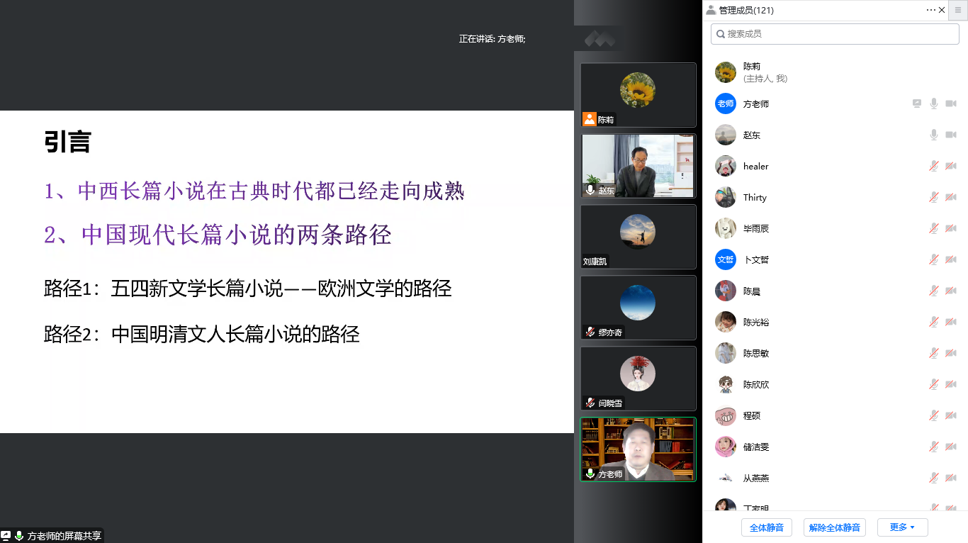 方維保教授在講座里提出,中國現代長篇小說文體有兩條發展路徑,一是五四新文學長篇小說的歐洲文學路徑,二是中國明清文人長篇小說的發展路徑。方維保教授以大量的小說文本闡釋為例,完整梳理了中國現代長篇小說及其文體發展史,具體包括:五四時代的現代長篇小說文體探索、1930年代長篇小說文體成熟到新文體期待和1940年代長篇小說文體的新變。