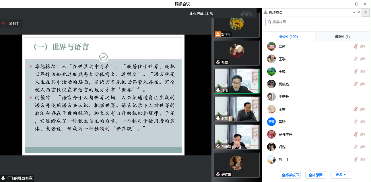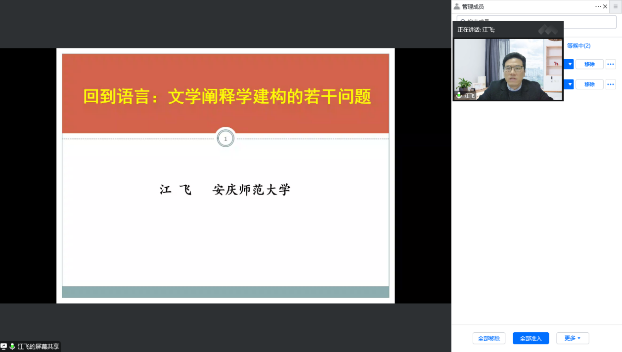 11月16日晚,文學與傳媒學院第1期中國語言文學學科學術沙龍以線上線下結合的形式舉辦。安慶師范大學人文學院教授、安徽省評論家協(xié)會副主席江飛應邀做題為“回到語言:文學闡釋學建構的若干問題”的學術講座。學院學術委員會主任、中國語言文學學科負責人趙東教授主持講座,全院教師、學生代表130余人參加。