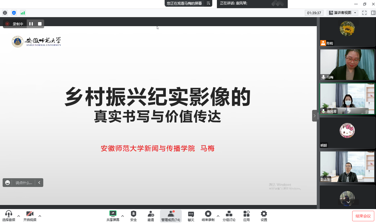 11月22日下午,文學(xué)與傳媒學(xué)院學(xué)術(shù)活動月系列活動之“湯山傳媒講壇”首場活動精彩開講。安徽師范大學(xué)新聞與傳播學(xué)院副院長、教授、博士生導(dǎo)師馬梅應(yīng)邀作題為“鄉(xiāng)村振興紀(jì)實(shí)影像的真實(shí)書寫與價值傳達(dá)”的學(xué)術(shù)講座。講座由文學(xué)與傳媒學(xué)院院長彭正生教授主持,學(xué)院師生通過線上線下方式積極參與。