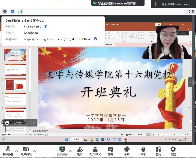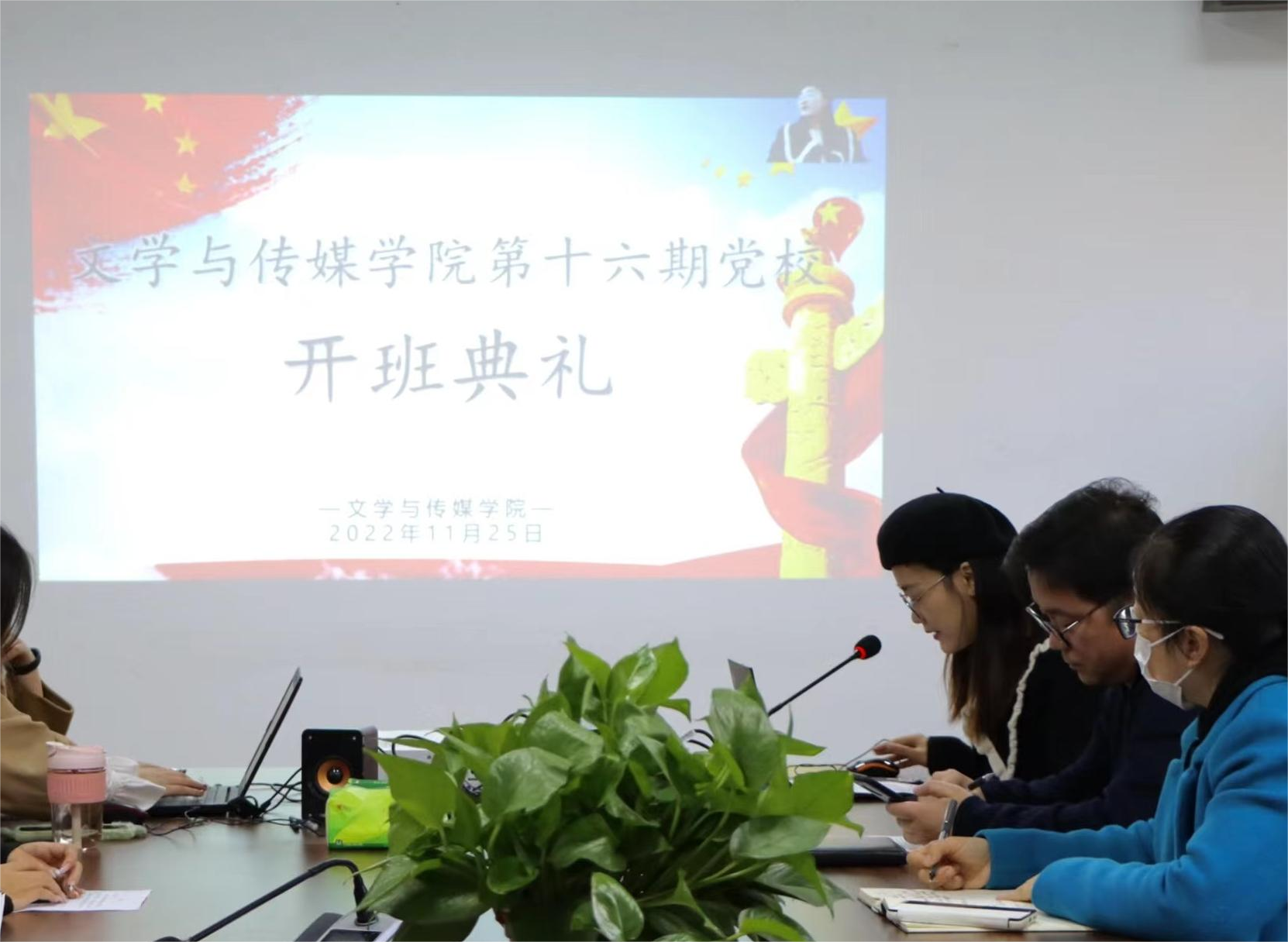 為全面學(xué)習(xí)貫徹黨的二十大精神,進一步引導(dǎo)大學(xué)生堅定理想信念、加強黨性修養(yǎng),根據(jù)學(xué)院黨委部署安排,11月25日中午,文傳學(xué)院在敏行樓會議室隆重召開第十六期黨校開班儀式。開班典禮由兼職組織員任冰冰主持,黨委書記袁鳳琴、副書記孫冰、學(xué)生支部書記沈潔、輔導(dǎo)員劉偌熙、陳旭光及學(xué)員代表準(zhǔn)時參與,其他學(xué)員通過騰訊會議線上參與。
