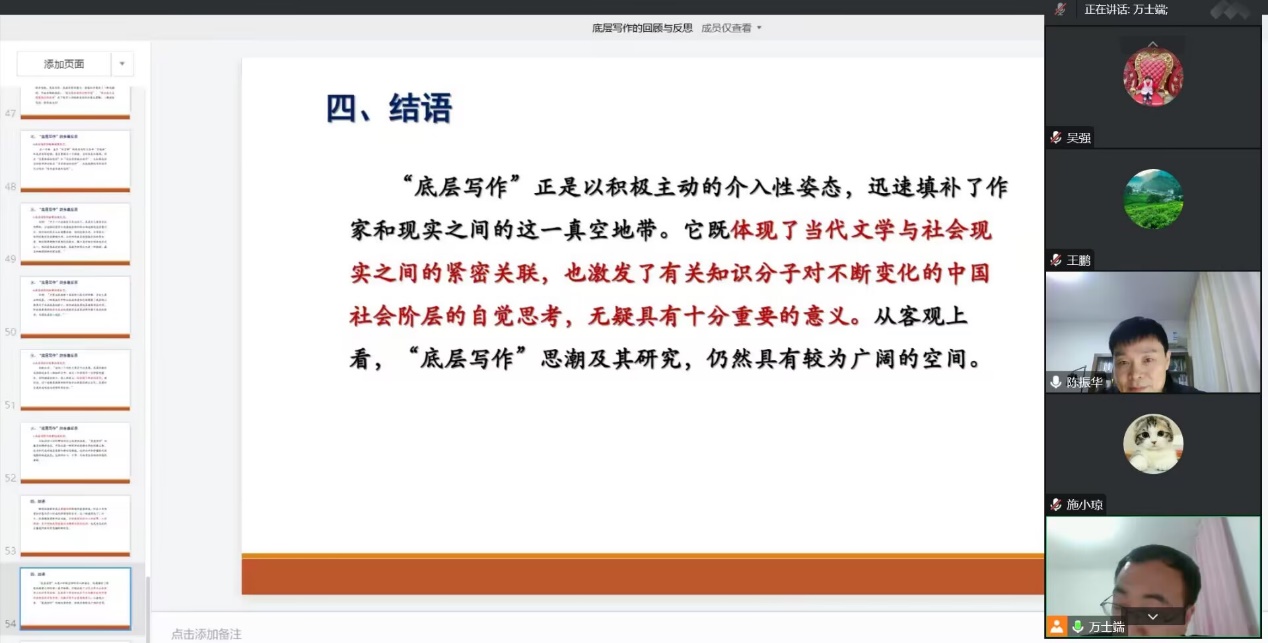 陳振華教授從三個方面對“底層寫作”進行了系統回顧和學理思考: “底層”歷史化闡釋與“底層寫作”,“底層寫作”經典文本闡釋, “底層寫作”多維反思。在“底層寫作”的多維反思中,重點論述了底層寫作的思想傾向反思、苦難書寫反思、文學性和敘事倫理反思。