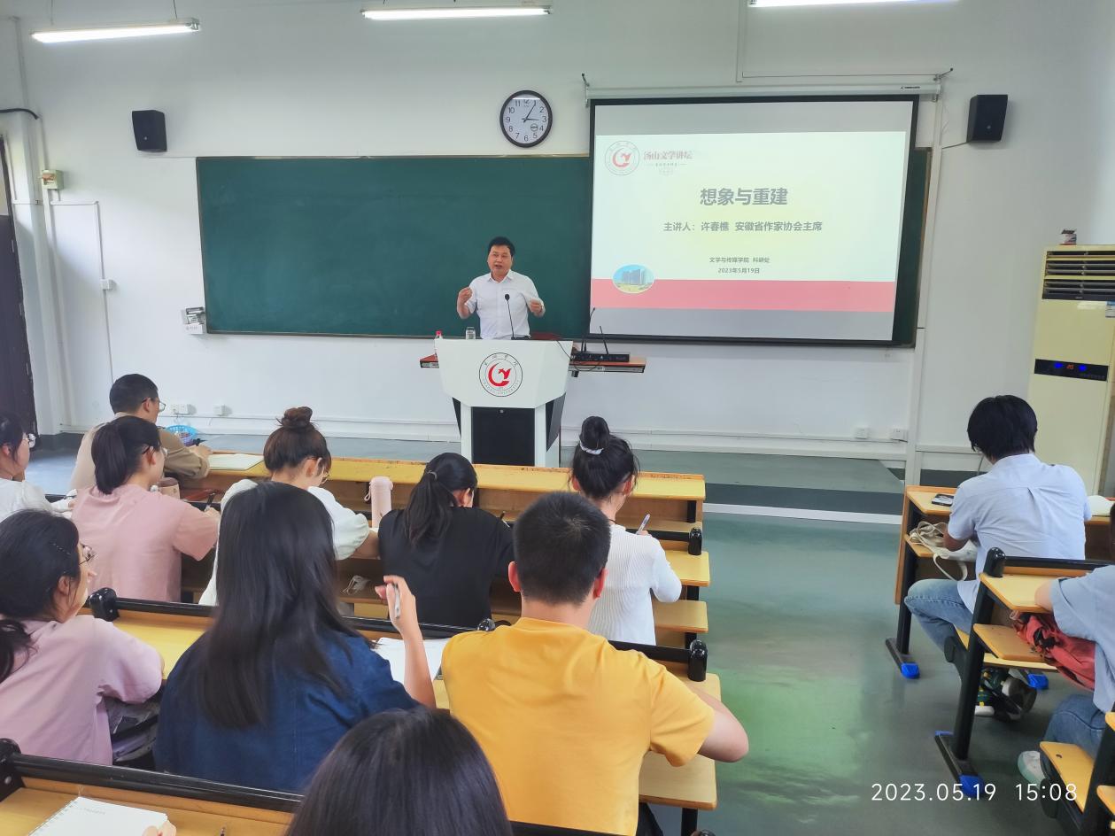 5月19日,安徽省作協主席許春樵應邀主講文學與傳媒學院第5期“湯山文學講壇”,以“想象與重建”為主題,闡發了他對文學敘事與想象的看法,分享了他個人創作的經驗。文學與傳媒學院院長彭正生教授主持講座。