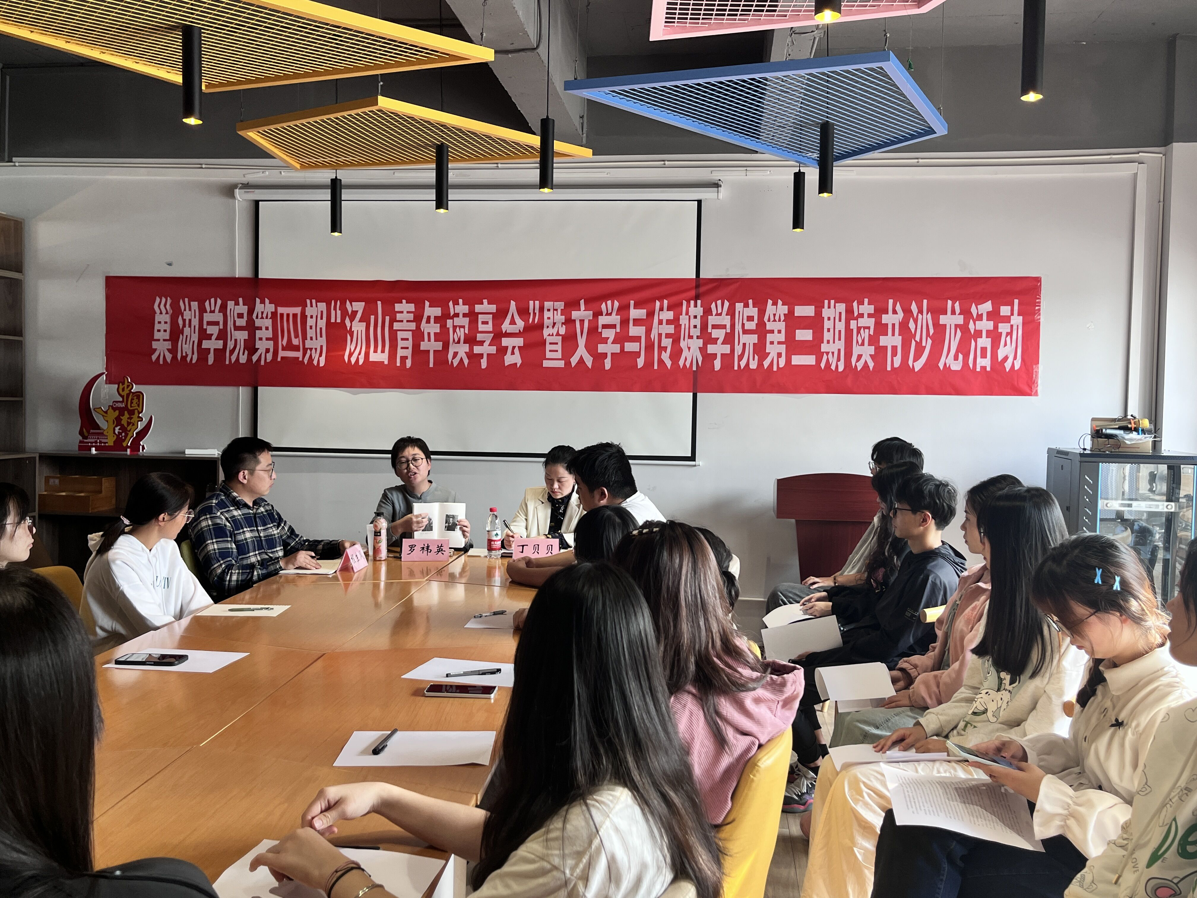 為高質量推進校園文化內涵建設,進一步提高大學生的閱讀興趣,10月11日下午,文學與傳媒學院在湯山書苑舉辦第四期“湯山青年讀享會”暨文學與傳媒學院第三期讀書沙龍活動。本次活動邀請了文學與傳媒學院羅祎英博士、馬克思主義學院丁貝貝老師擔任指導嘉賓,近40名同學現場參加沙龍活動,另外有近600名學生線上參加了此次活動?;顒佑晌膫鲗W院團委負責人程生風主持。