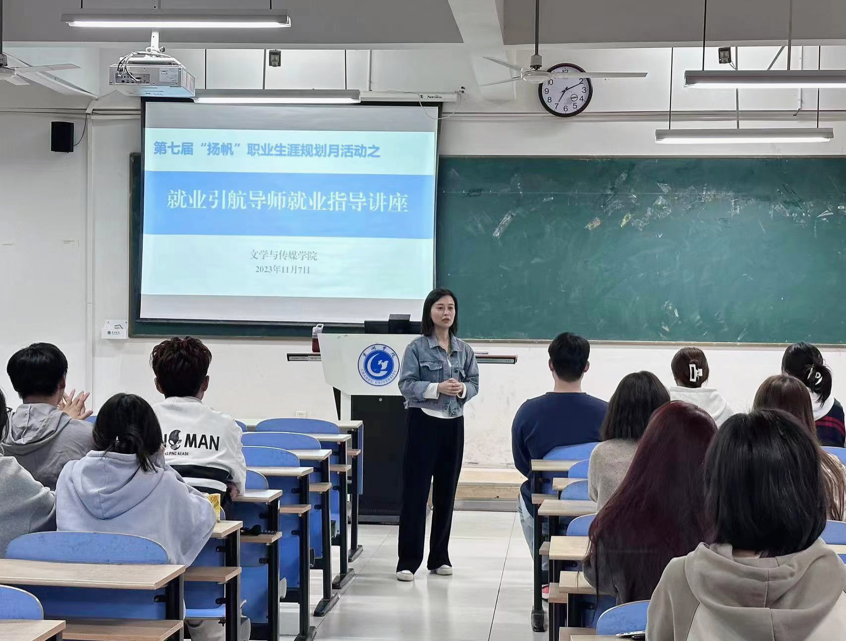 2023年11月7日晚,巢湖學院第七屆“揚帆”職業生涯規劃月活動之文學與傳媒學院就業引航導師就業指導講座在慎思樓中101舉辦。本次講座由卜洪漩老師主講,2021級廣播與電視專業、網絡與新媒體專業和廣告學百余名學生參加講座。