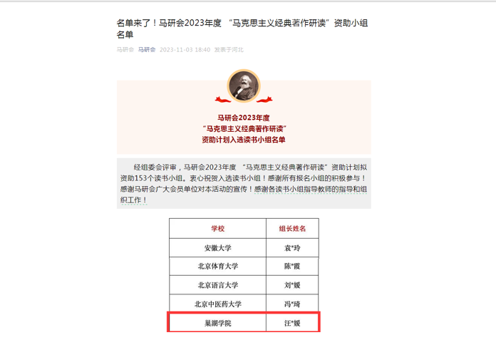 2023年11月4日,由中國高等教育學會馬克思主義研究分會主辦的2023年度“馬克思主義經典著作研讀”資助計劃啟動大會在線上隆重召開,文學與傳媒學院2022級漢語言文學專業汪佳媛等同學申報的“毛澤東文藝思想”研讀小組成功入選獲資助讀書小組名單。該小組成員均來自“春筍文學社”,這是巢湖學院學子首次參加該活動,安徽省僅有六個高校會入選。