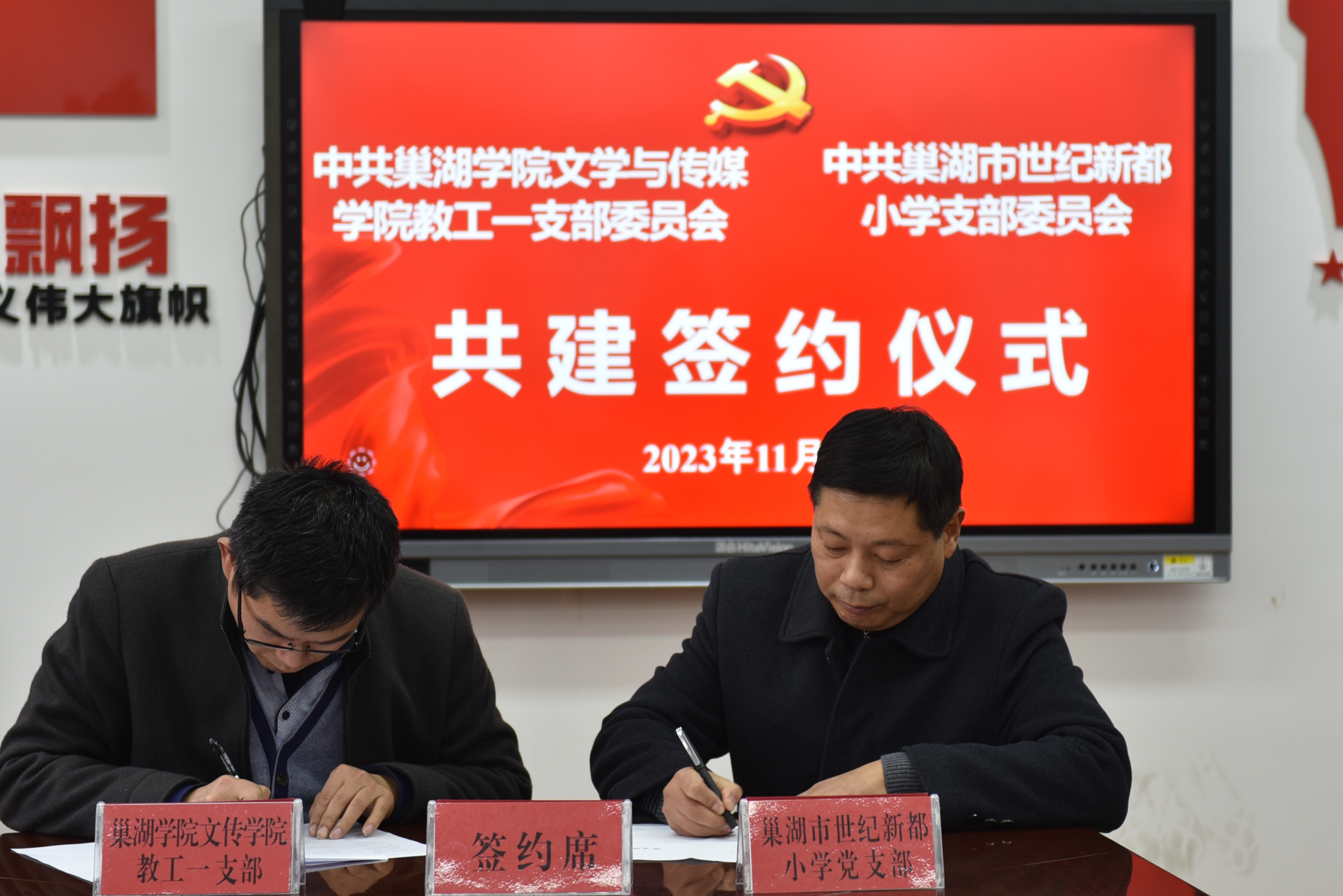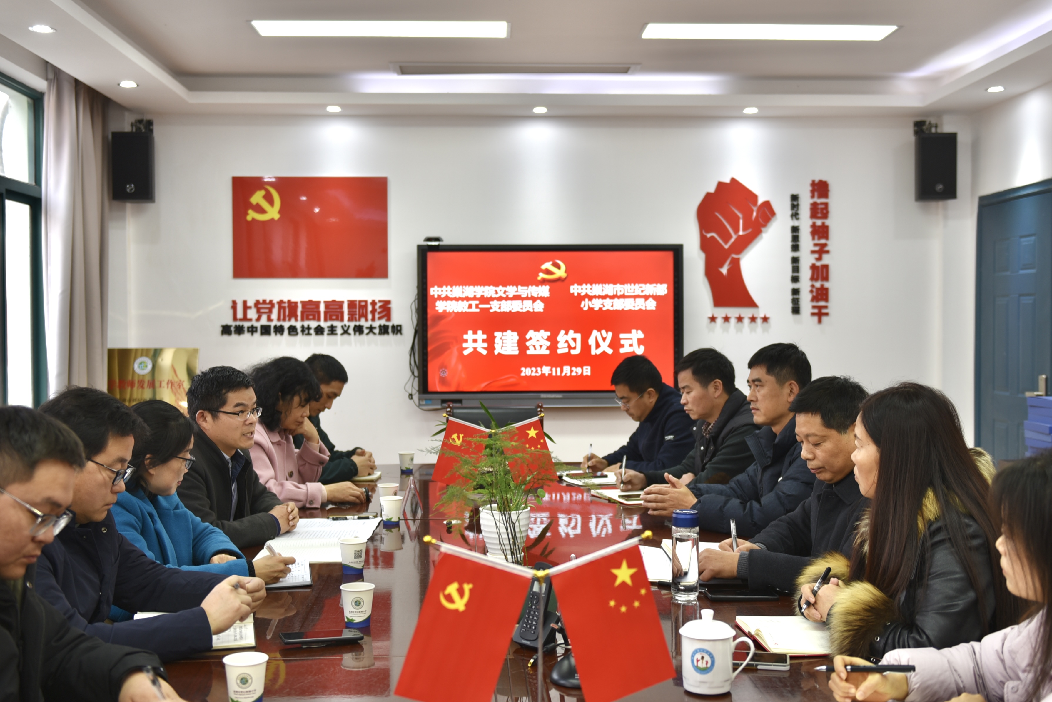 為進一步拓寬基層黨組織建設協作共贏的途徑,推進黨組織工作提質增效,2023年11月29日下午,文學與傳媒學院教工一支部與世紀新都小學黨支部在世紀新都小學舉行黨建共建簽約儀式。世紀新都小學校長、黨支部書記鄭宏玉及支部班子成員,文學與傳媒學院黨委書記袁鳳琴、副書記孫冰、教工一支部書記吳強及支部班子成員參加了活動,活動由鄭宏玉主持。