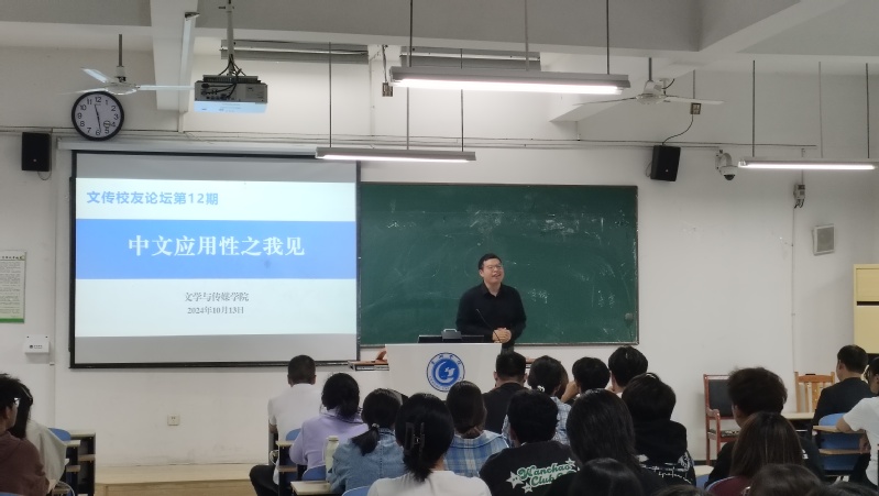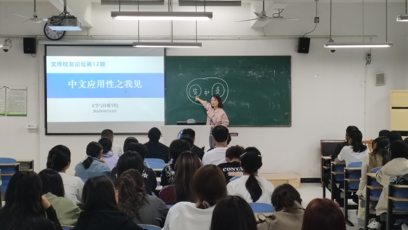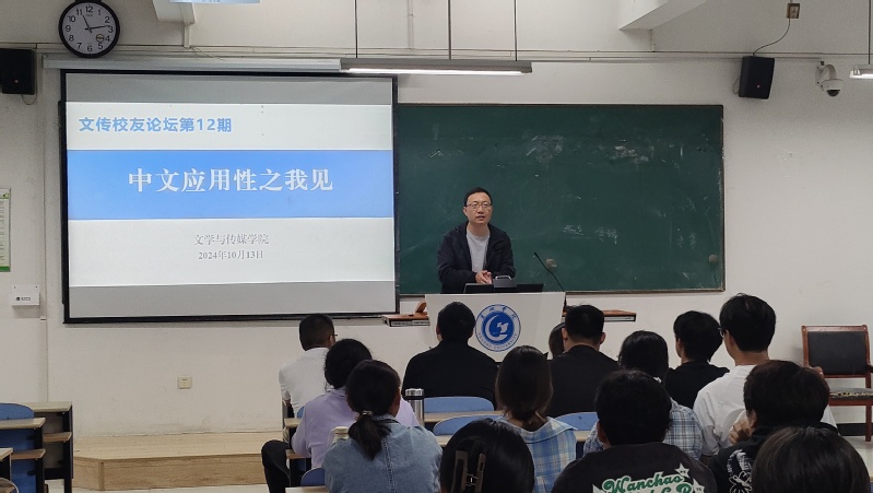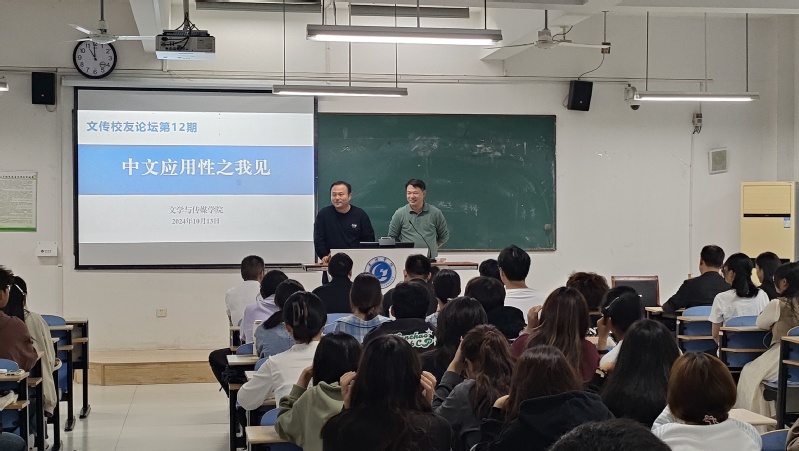 10月13日上午,值2024年校友返校日暨首屆秩年校友返校活動之際,文學與傳媒學院在慎思樓北102教室舉辦了第12期文傳校友論壇,邀請8位中文系校友,讓他們與2024級漢語言文學專業同學面對面交流,暢談對中文應用性的理解。論壇由學院黨委書記袁鳳琴主持。