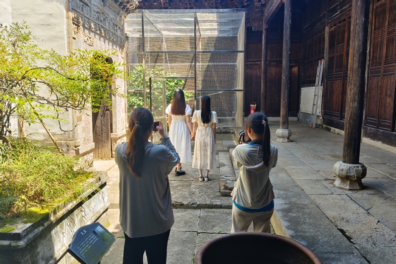 對接會后,團隊成員開展實地探訪。鏡頭先后對準侯村祠堂的飛檐斗拱、張大千父母墓的靜謐氛圍與寶塔寺的古樸風貌,用特寫鏡頭記錄石雕、碑文等文化符號;在藍緣民宿,團隊捕捉到庭院景觀與民宿獨特的教室風格,為后續民宿品牌宣傳積累素材。